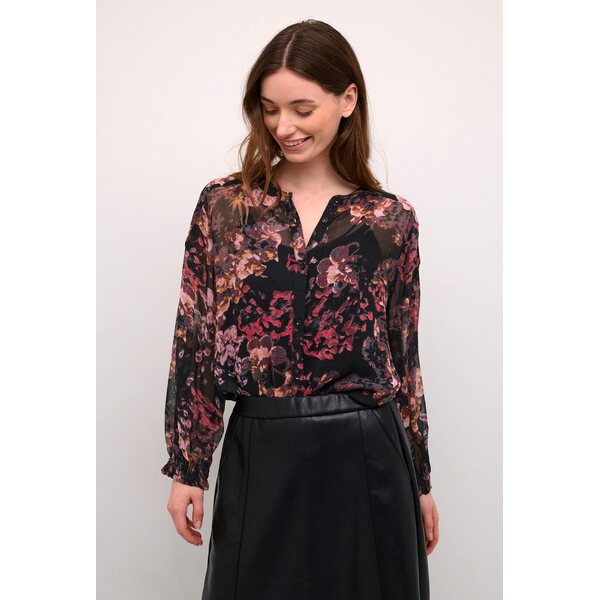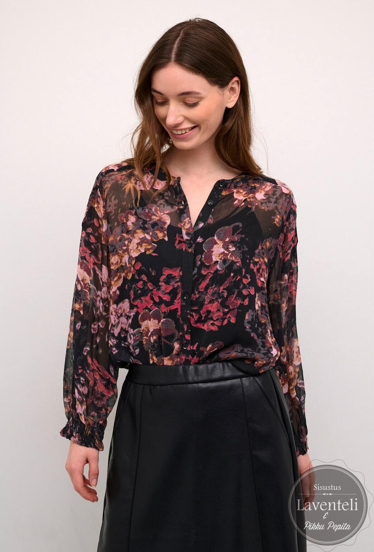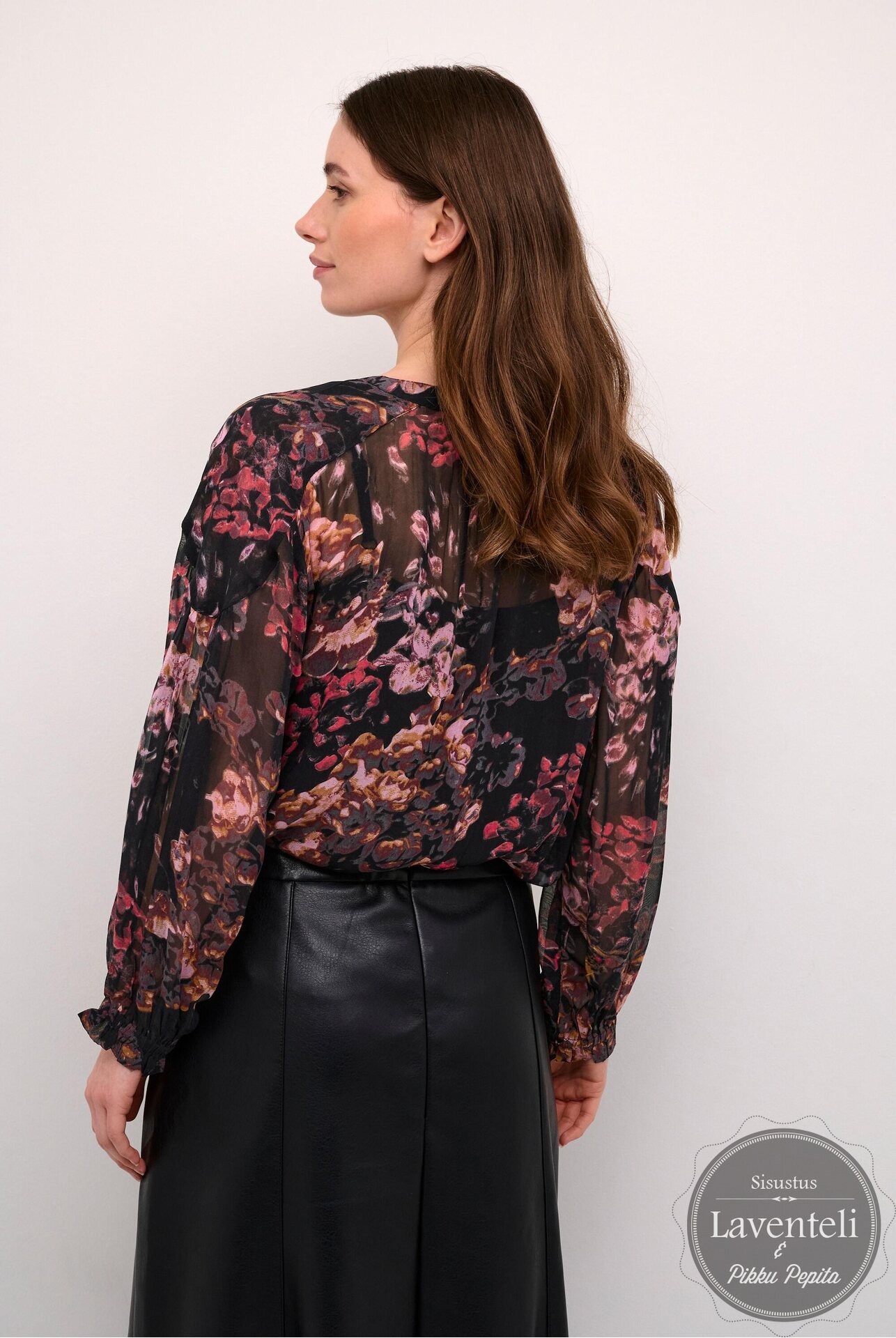Tyylikäs ja ajattoman kaunis pitkähihainen kukallinen pusero, jossa on suora siluetti ja V-pääntie.
