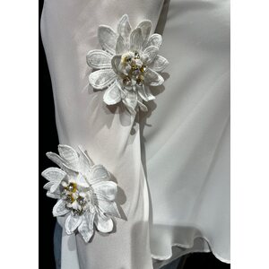 Popis produktuErityisen kaunis valkoinen paita, jonka hihat leikattu niin, että olkapään kohta jää paljaaksi. Hihaan on kiinnitetty isoja kangaskukkia joiden keskellä isoja strassitimantteja. Hiha levenee hieman alaspäin, laskeutuu kauniisti ja tekee paidasta juhlavan. Syvä v-pääntie, jonka alla pieni vekki antaa hieman lisää tilaa etuosaan.