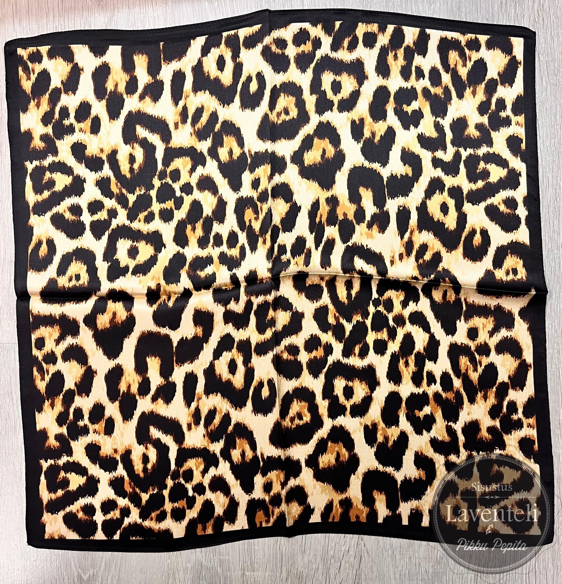 Ihanan kevyt silkkihuivi, jossa mustan, ruskean ja kullansävyinen pantterikuvio.