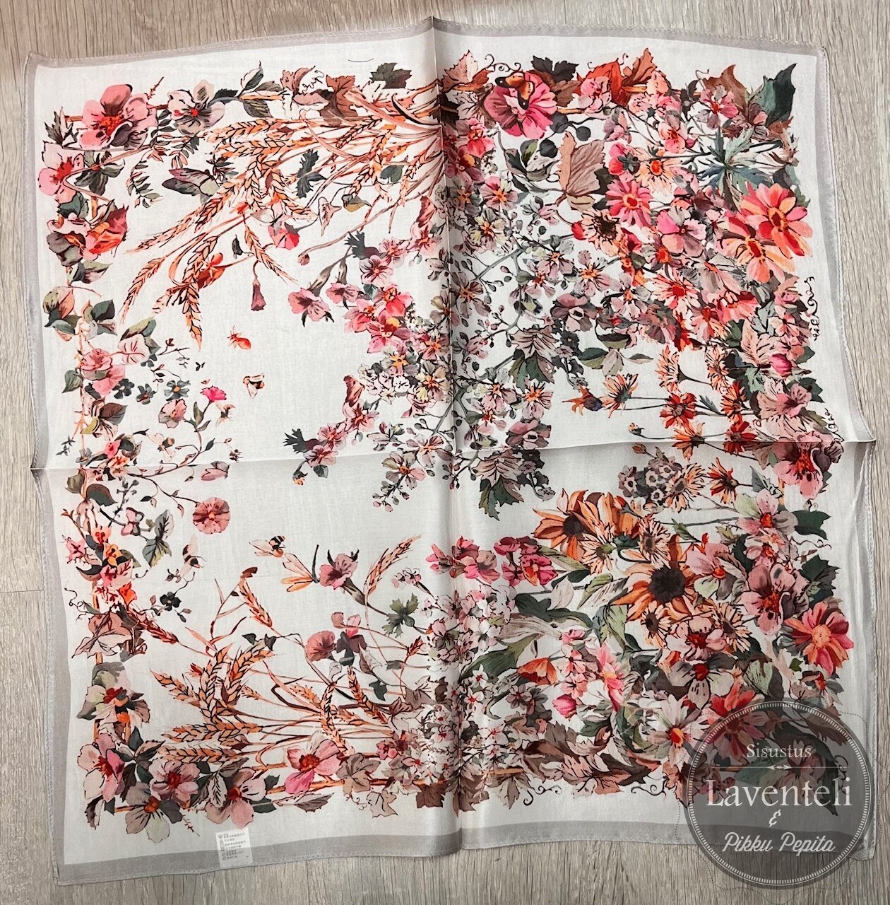 Ihanan kevyt silkkihuivi, jossa valkoisella pohjalla kaunis kukkakuvio. Erilaisia kukkia ja vehnän tähkiä.