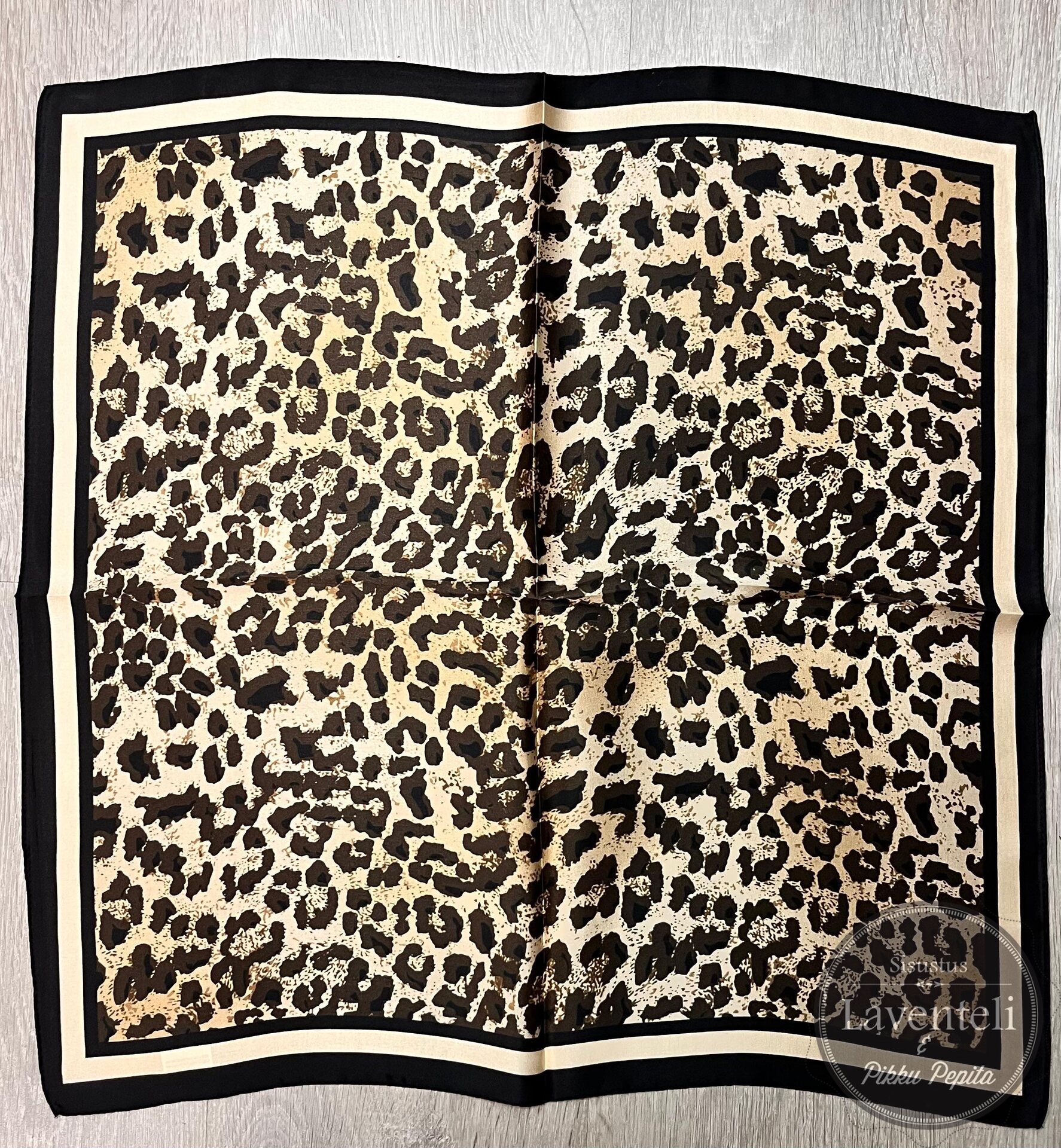 Ihanan kevyt silkkihuivi, jossa beigellä/kullanvärisellä pohjalla mustaa pantterikuviota. Reuna musta, reunaa kiertää myös kullanvärinen raita.