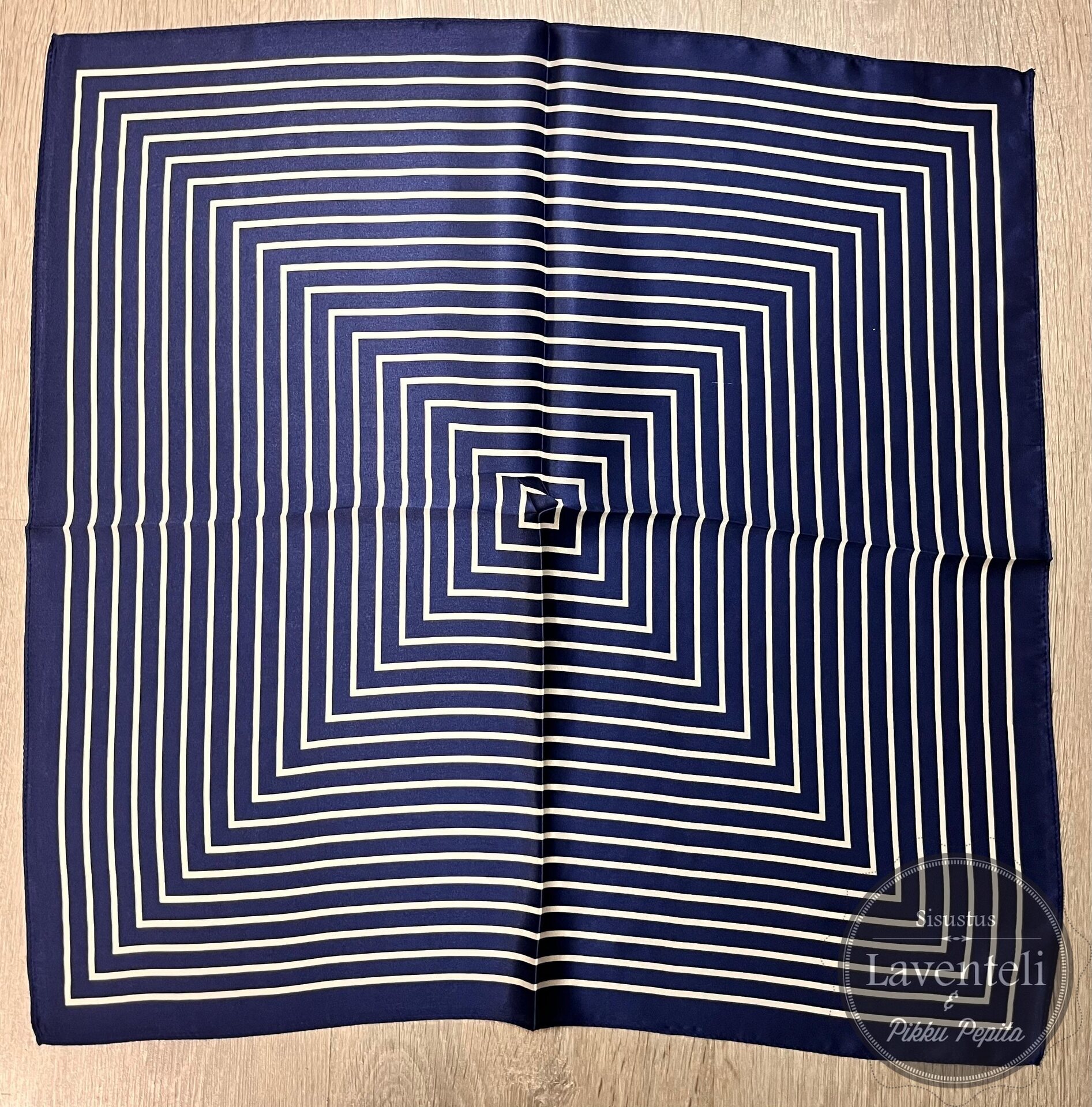 Ihanan kevyt silkkihuivi, jossa kapeita valkoisia ja leveämpiä tummansinisiä raitoja.
