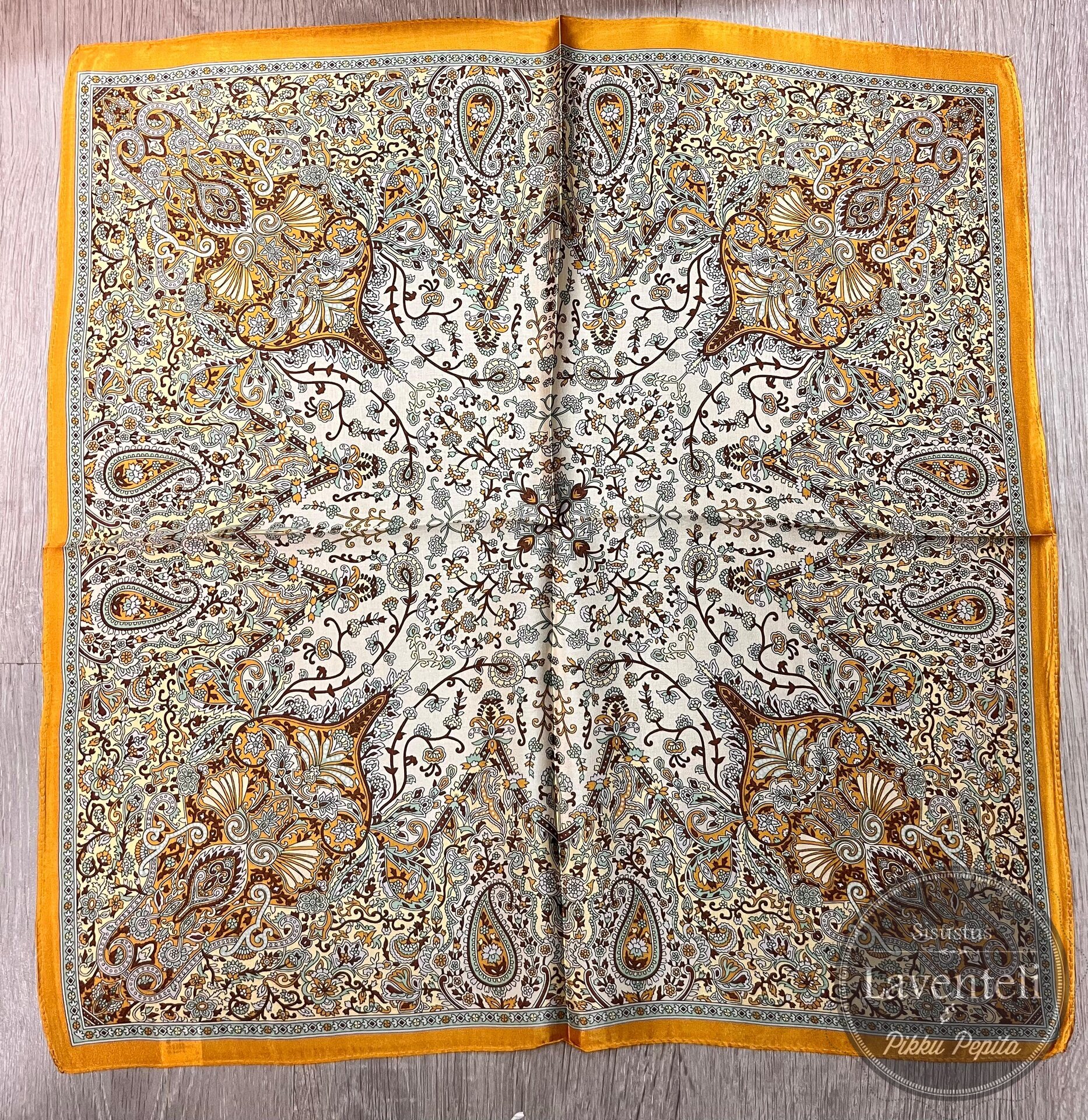 Ihanan kevyt silkkihuivi, jossa upea hieman itämainen kuvio. Värit ovat upeita maanläheisiä ja hyvin yhteensopivia värejä.