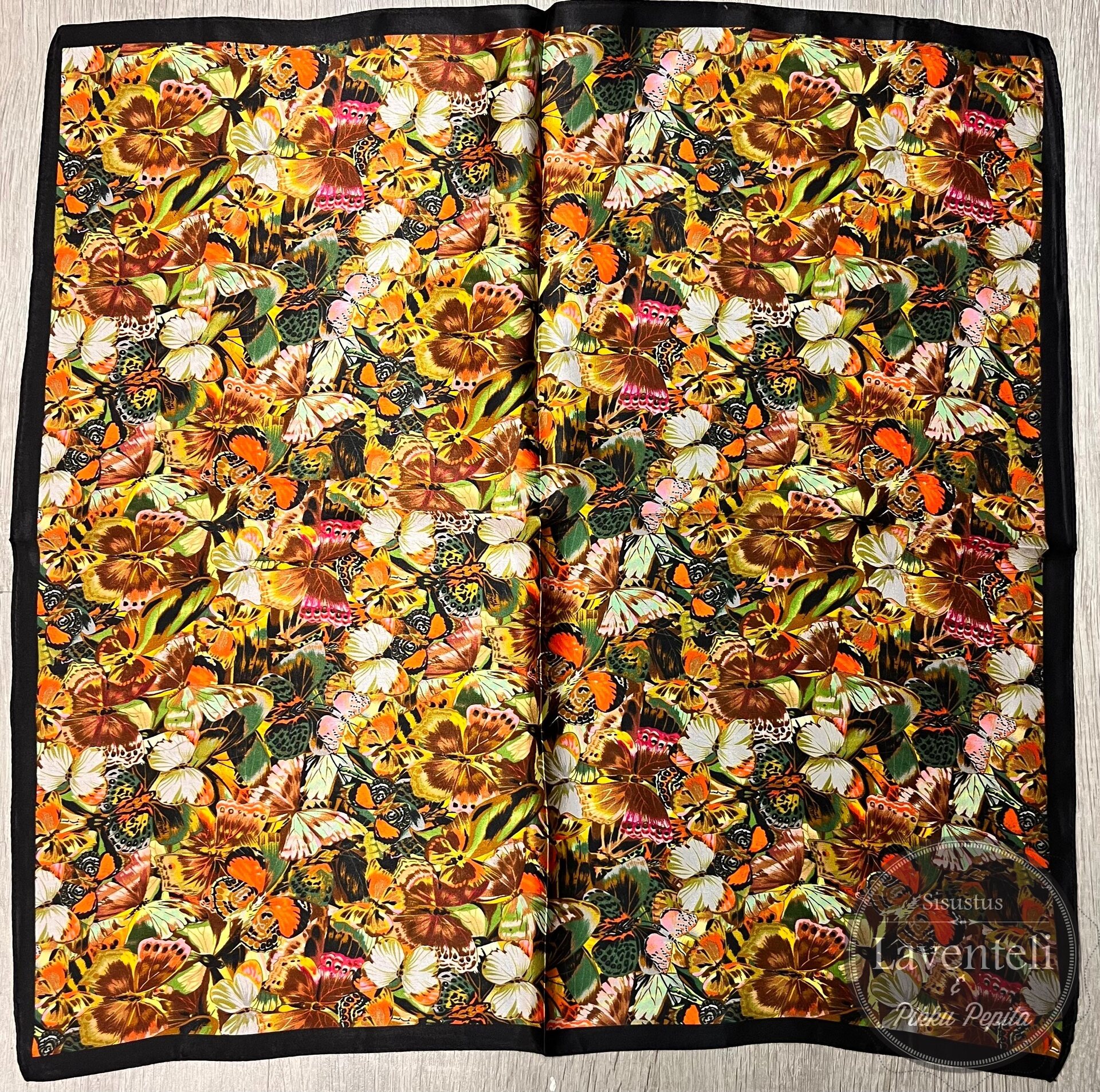 Tumma kasviteemainen silkkihuivi perhosilla, 50*50 cm