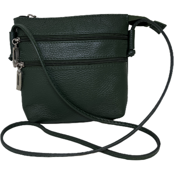 Pikkulaukku, jossa kolme vetoketjullista osastoa. Takapuolella vetoketjullinen tasku.