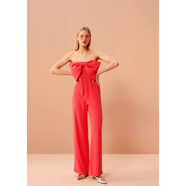Tämä MUSTA olkaimeton haalari on koristeltu suurella rusetilla rinnassa. Lahkeet ovat leveät ja väljät. Tämä malli ei koonsa puolesta mahdu isorintaiselle. Lahkeet ovat melko pitkät ja niitä lyhyempi nainen saa varmasti lyhentää. Hyvä malli pitkäjalkaiselle naiselle.
