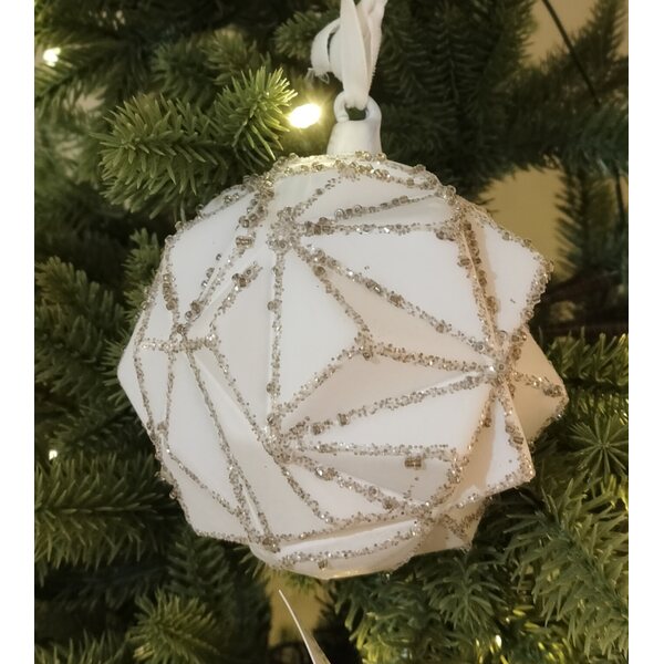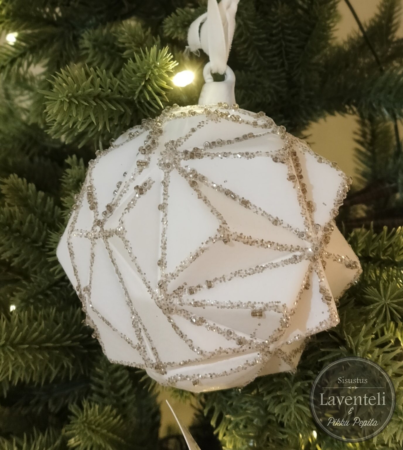 Valkoinen geometrinen joulupallo, jossa kohollaan olevia kulmia ja hopeanväristä kimalletta. Voit ripustaa niin joulukuuseen kuin vaikka kranssiin roikkumaan.