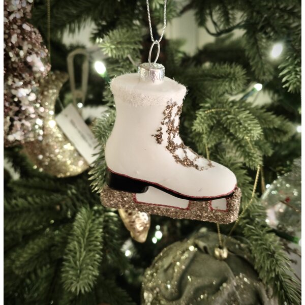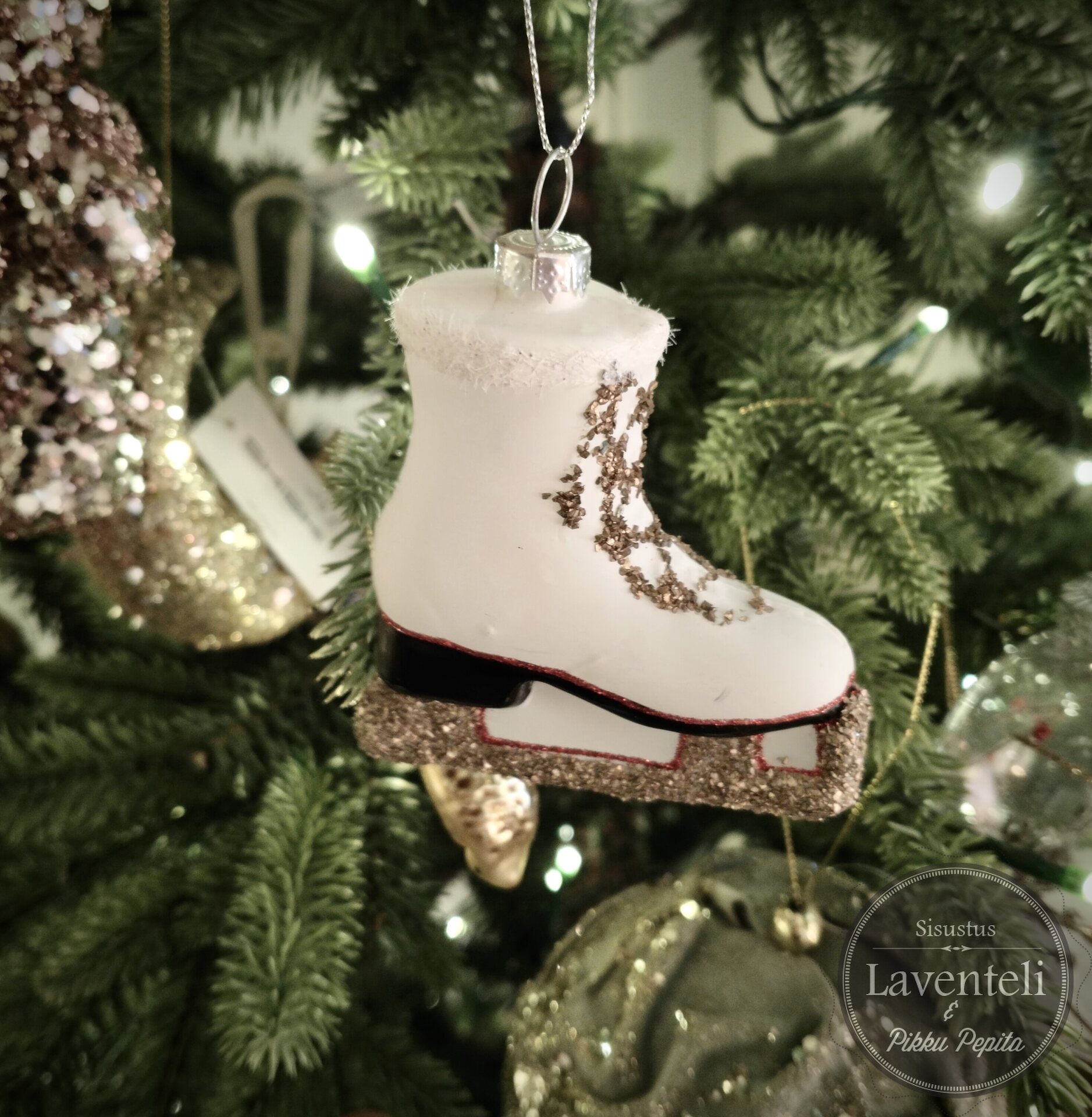 Valkoinen luistinkoriste on hieno lahja esimerkiksi nuorelle taitoluistelijalle. Luistimessa kullanvärinen glitteröity terä ja nauhat.