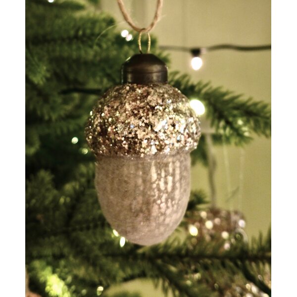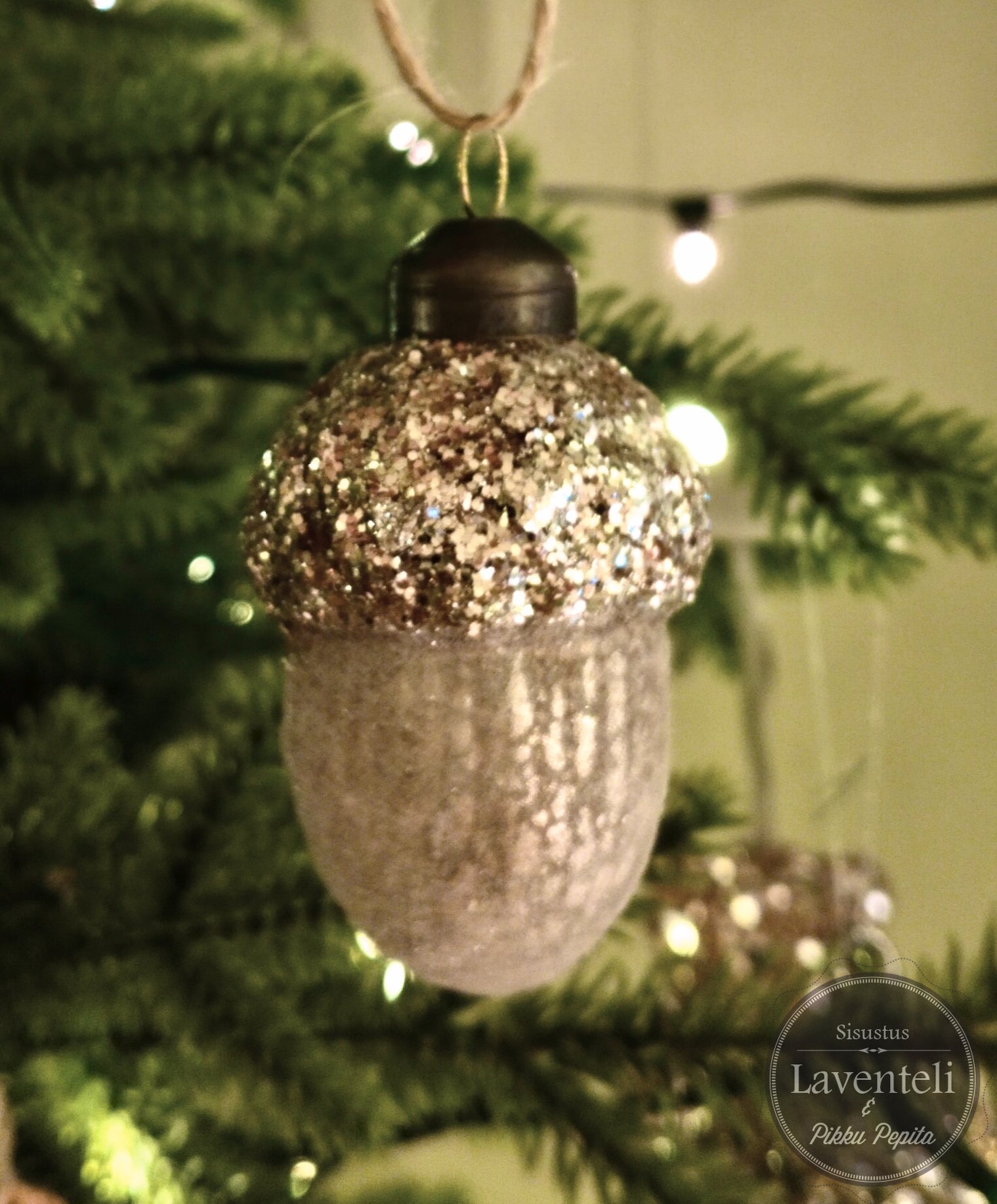 Kimaltava tammenterho koriste joulukuuseen tai muuhun joulun ajan koristeeseen. Itse terho on harmahtava, mutta pinnassa kultaa ja hopeaa kimaltavaa glitteriä.