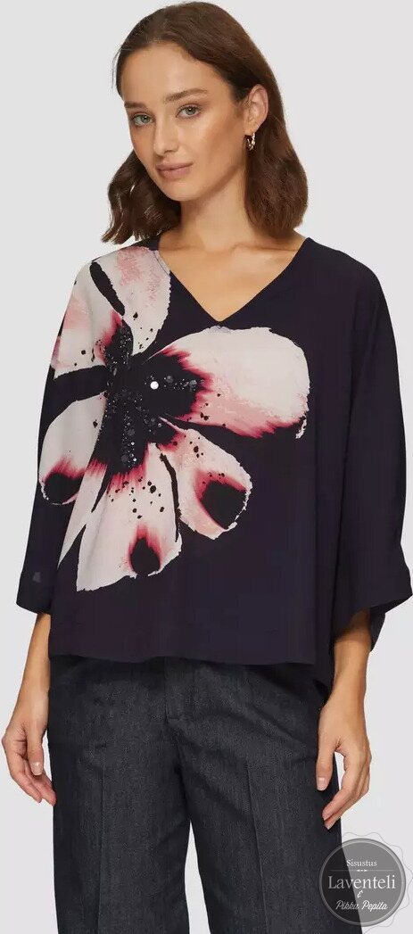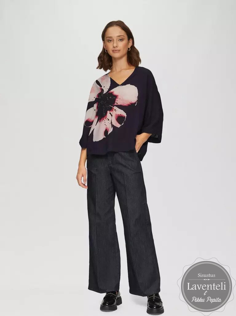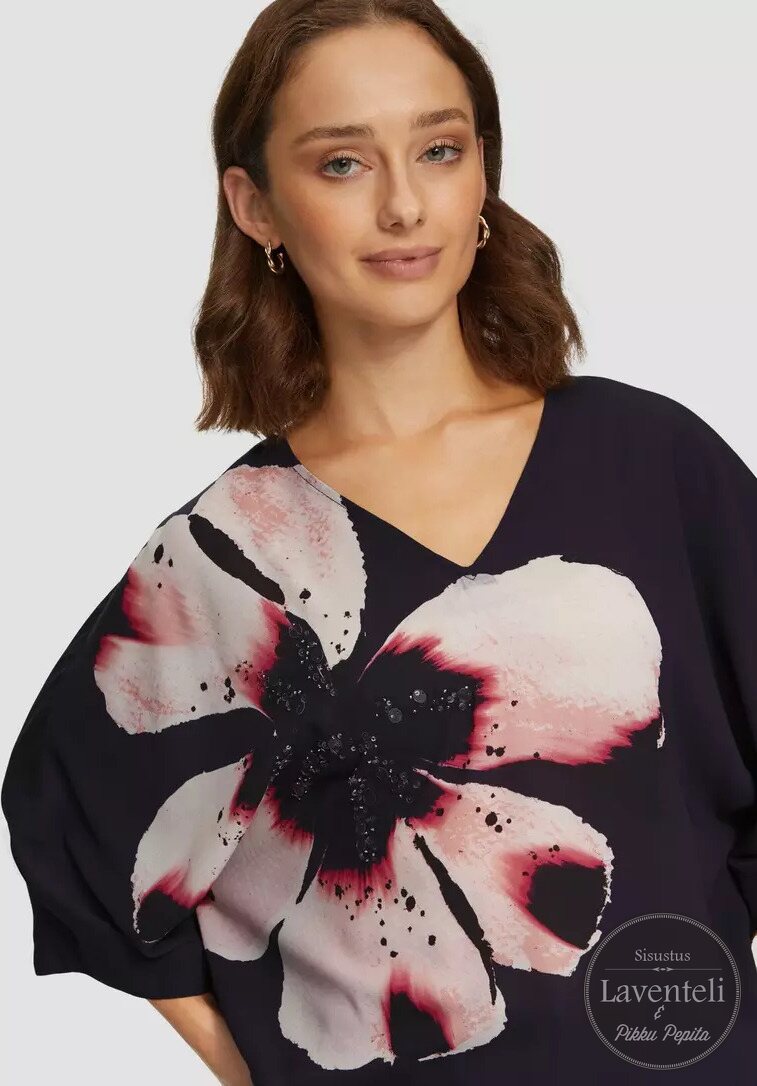 Paidan katseenvangitsijana toimii paljetein koristeltu vaaleanpunainen kukka, joka antaa asulle ylellisen ja huolitellun ilmeen. Imarteleva V-pääntie keventää kokonaisuutta, ja 3/4-hihat tuovat rentoa eleganssia. Yhdistä korkeavyötäröisiin farkkuihin tai leveälahkeisiin housuihin ja luo vaivattoman tyylikäs look.