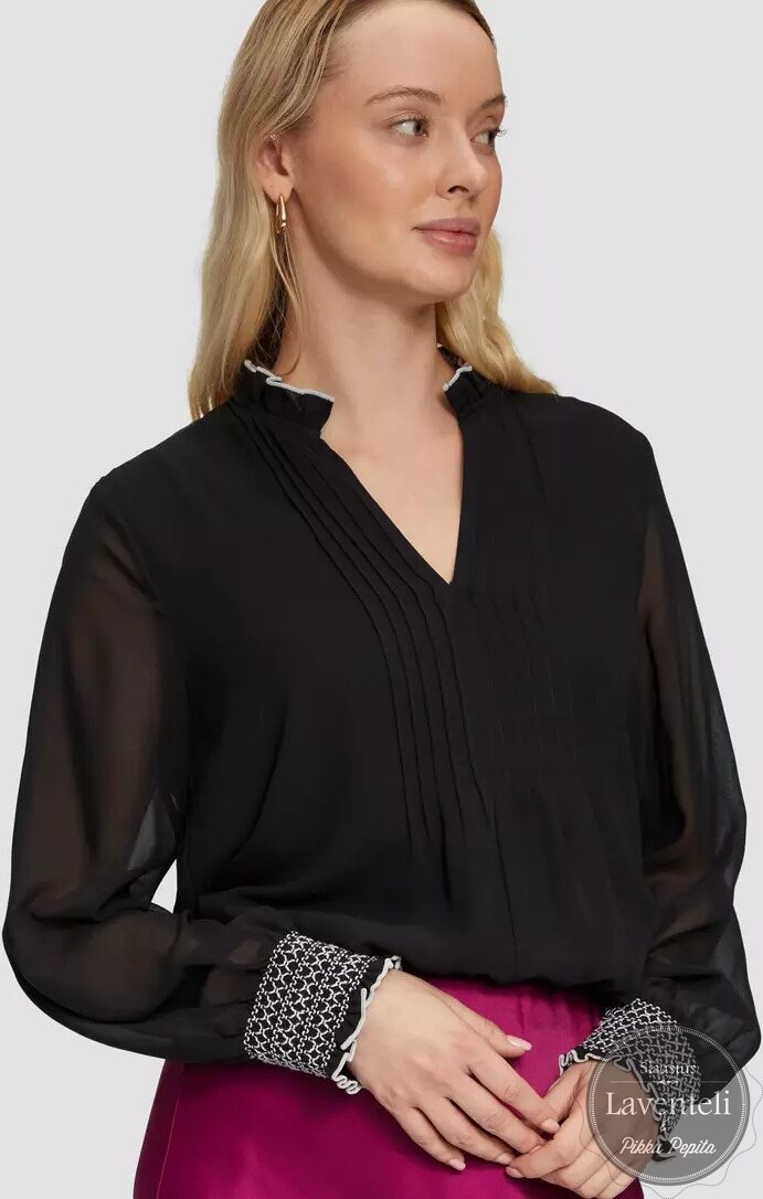 Tyylikäs röyhelökaulus ja huolella viimeistellyt koristetikkaukset tuovat ilmeeseen hienostunutta kontrastia. Tunikamainen pääntie ja pitkät hihat tekevät paidasta monikäyttöisen – se sopii yhtä hyvin rentoon arkipukeutumiseen kuin siistimpään toimistotyyliin. Yhdistä farkkuihin huolettoman chic-lookin luomiseksi tai hameeseen, kun haluat asuun pehmeää eleganssia.