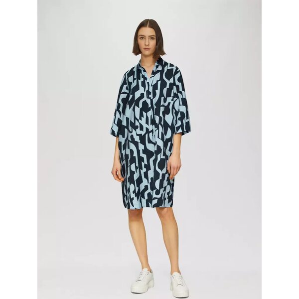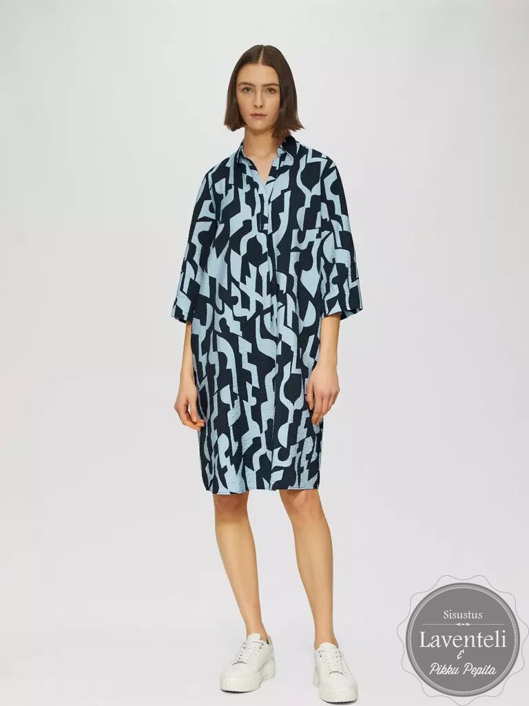 Klassinen paitakaulus tuo asuun ryhtiä, kun taas kokonaan kuviollinen printti luo raikkaan ja huolitellun ilmeen. Mekon puolipitkä pituus, pyöristetty helma ja hieman pidempi takahelma imartelevat vartaloa ja antavat liikkumatilaa. Hienostuneet laskokset ja käytännölliset sivutaskut viimeistelevät kokonaisuuden.