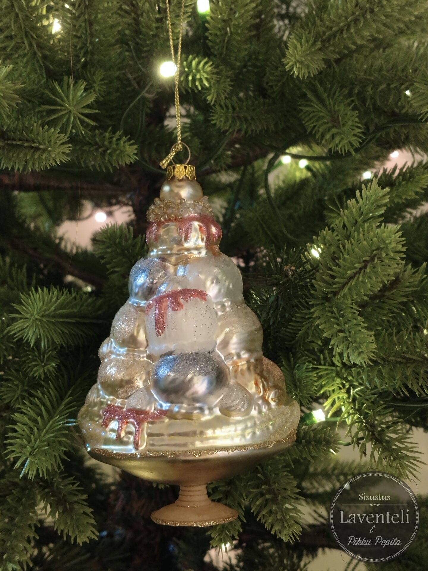 Kaunis kakkua muistuttava lasinen koriste joulukuuseen tai muuhun koristeeseen roikkumaan.