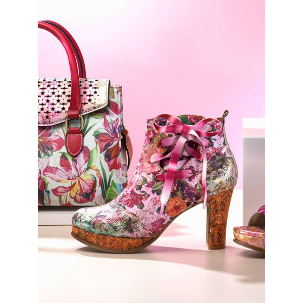 Nämä Laura Vitan korkeakorkoiset Hicao nilkkurit ovat pääosin nahkaa. Ihana roosansävyinen kukkakkuvio varsiosassa. Kärjessä sinisempi/vihreämpi kuosi.