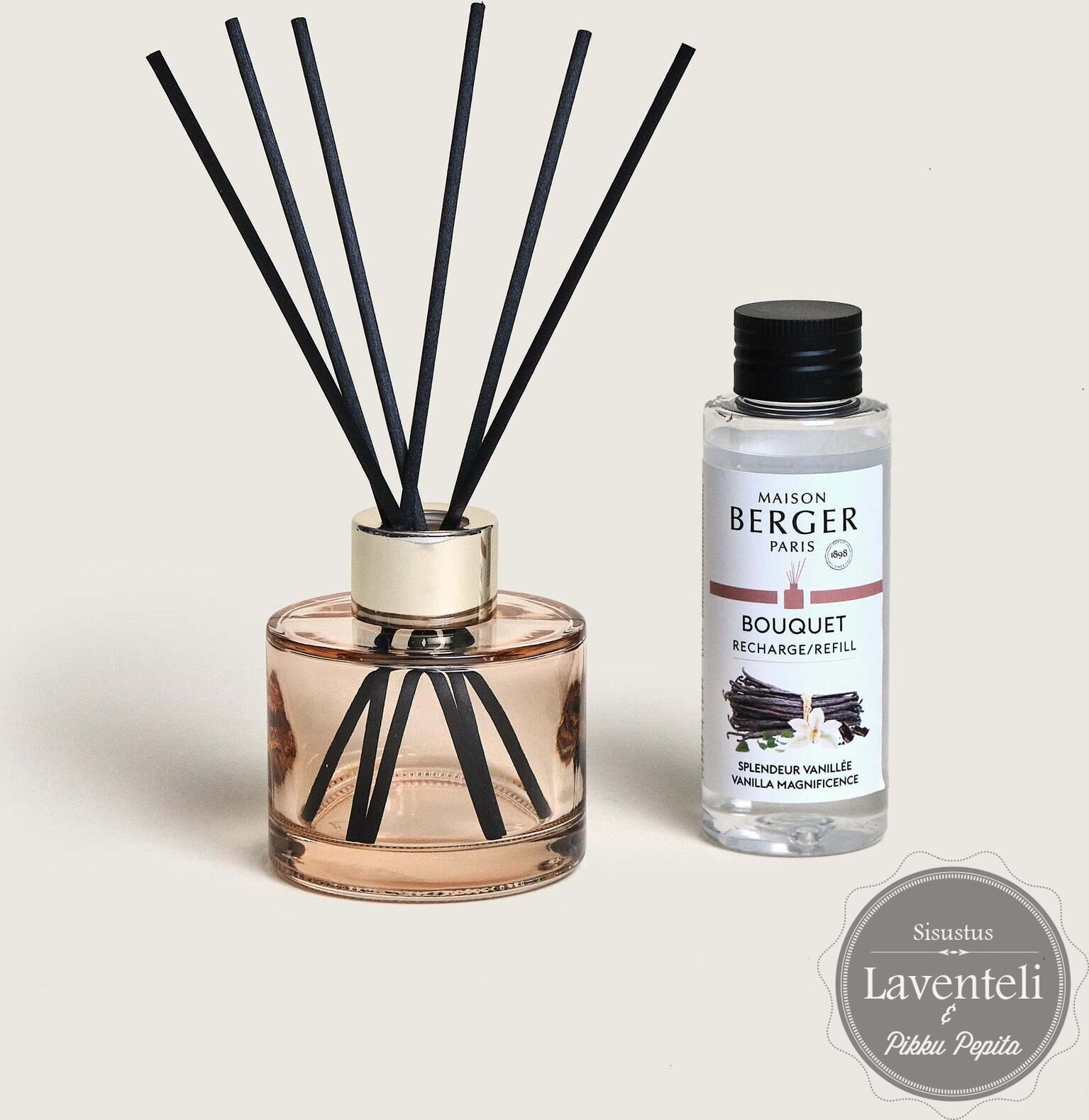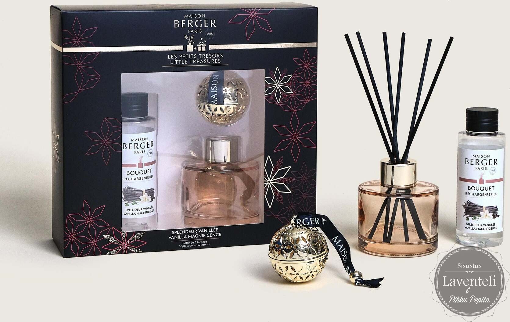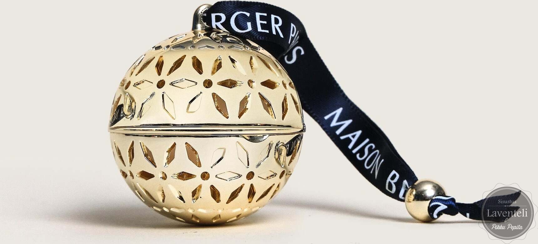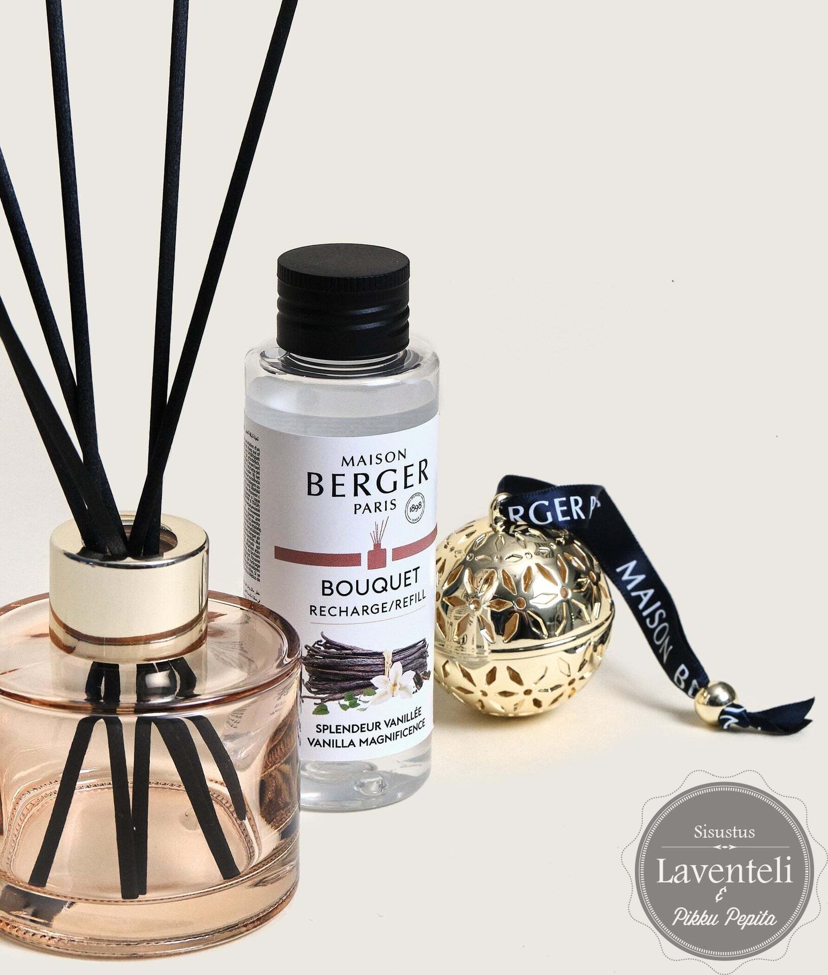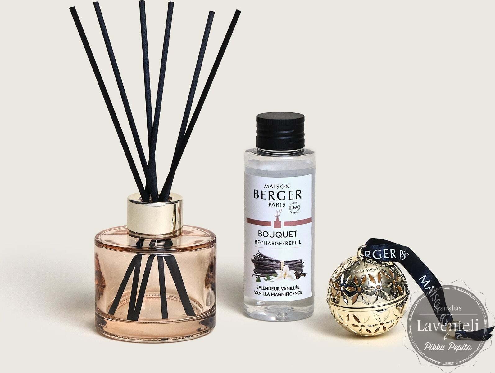 Mukana on hienostunut huonetuoksudiffuusori tikuilla, joka tuoksuttaa kotisi tasaisesti ja lempeästi. Sekä koristeellinen kullanvärinen riipus, joka on saanut inspiraationsa klassisesta pomanderista, joka on tunnettu aromaattisesta viehätyksestään vuosisatojen ajan. Elegantin sinisen Berger-narun ansiosta riipuksen voi asettaa monella eri tavalla: joulukuuseen, oven- tai ikkunankahvoihin, pöytäkoristeeksi tai jopa tyylikkääksi asusteeksi laukkuun.