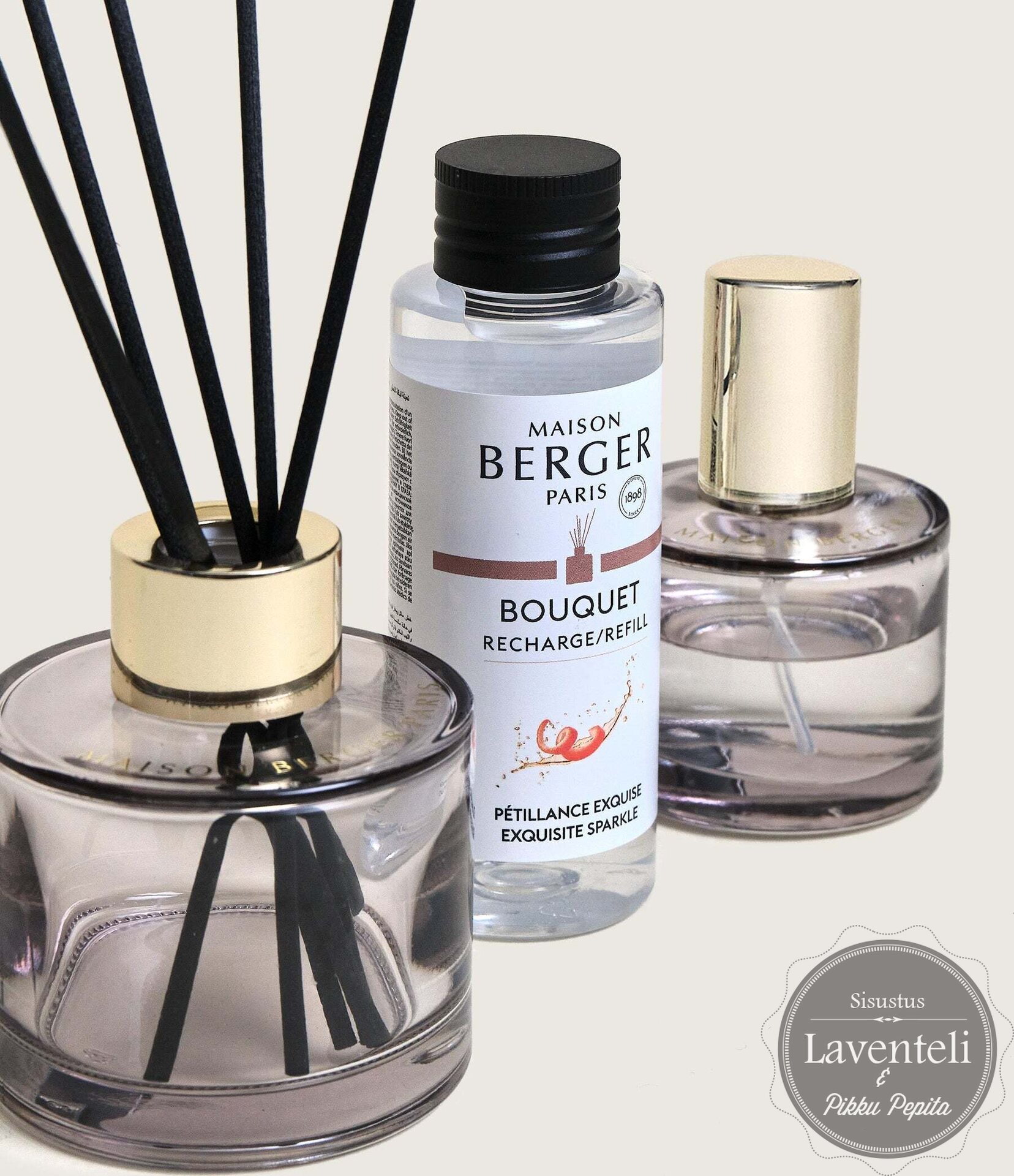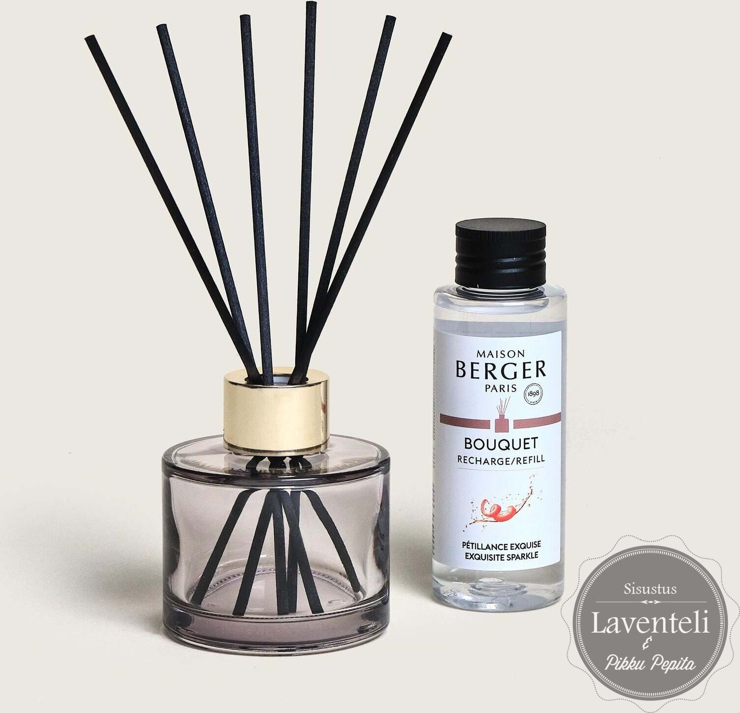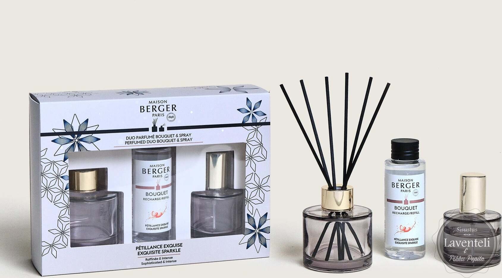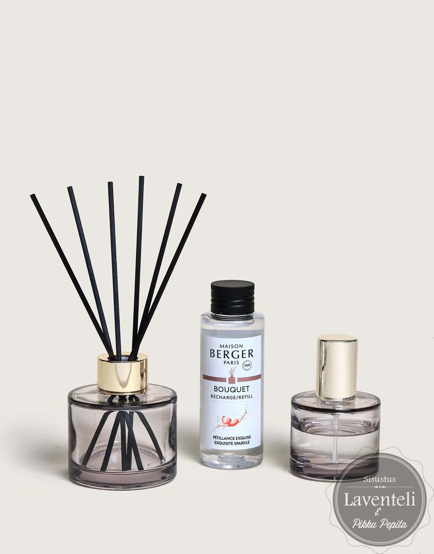 Tämä setti yhdistää elegantin huonetuoksudiffuusorin 90 ml:n täyttöpakkaukseen ja täydentää sitä uudella huonesuihkeella. Diffuusori tuoksuttaa kotiasi jatkuvasti ja hienovaraisesti, kun taas suihkeella voit tuoksuttaa yksittäisiä huoneita kohdennetusti ja spontaanisti – ihanteellinen nopeisiin, virkistäviin hetkiin. Tuoksu on exquisite sparkle eli kotoisammin shampanja. Meillä jo kahden vuoden ajan suosituin tuoksu.