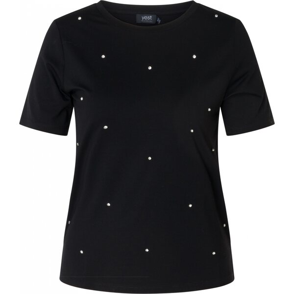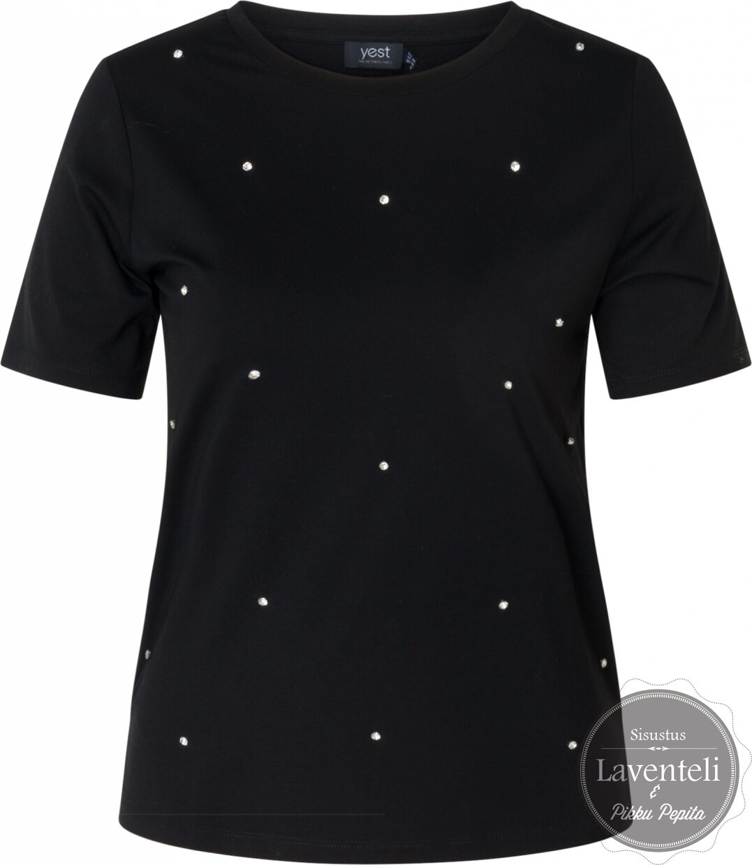 Paitaa koristavat pienet strassit, jotka tuovat siihen juuri sopivasti kimallusta – tehden siitä monikäyttöisen valinnan niin arkeen kuin iltamenoihin. Klassinen pyöreä pääntie, lyhyet hihat ja normaali mitoitus viimeistelevät ajattoman tyylin.
