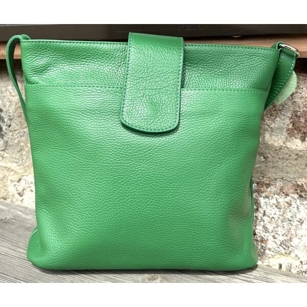 Olkalaukku pehmeää, laadukasta ja kaunista nahkaa. Laukku suljetaan päältä vetoketjulla ja lisäksi yläosan yli kääntyy myös kapea läppä.