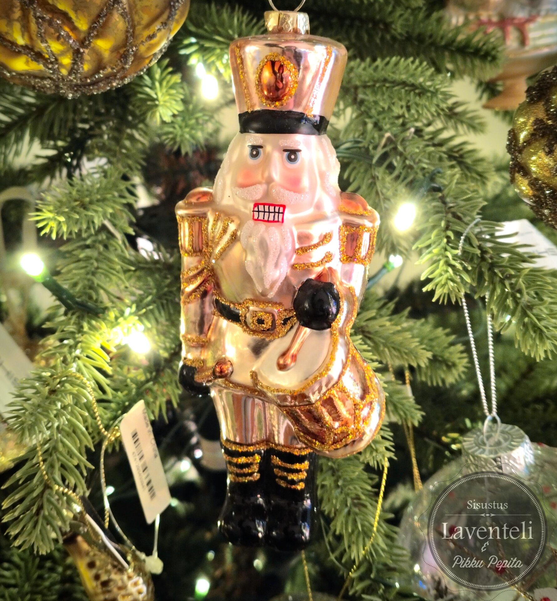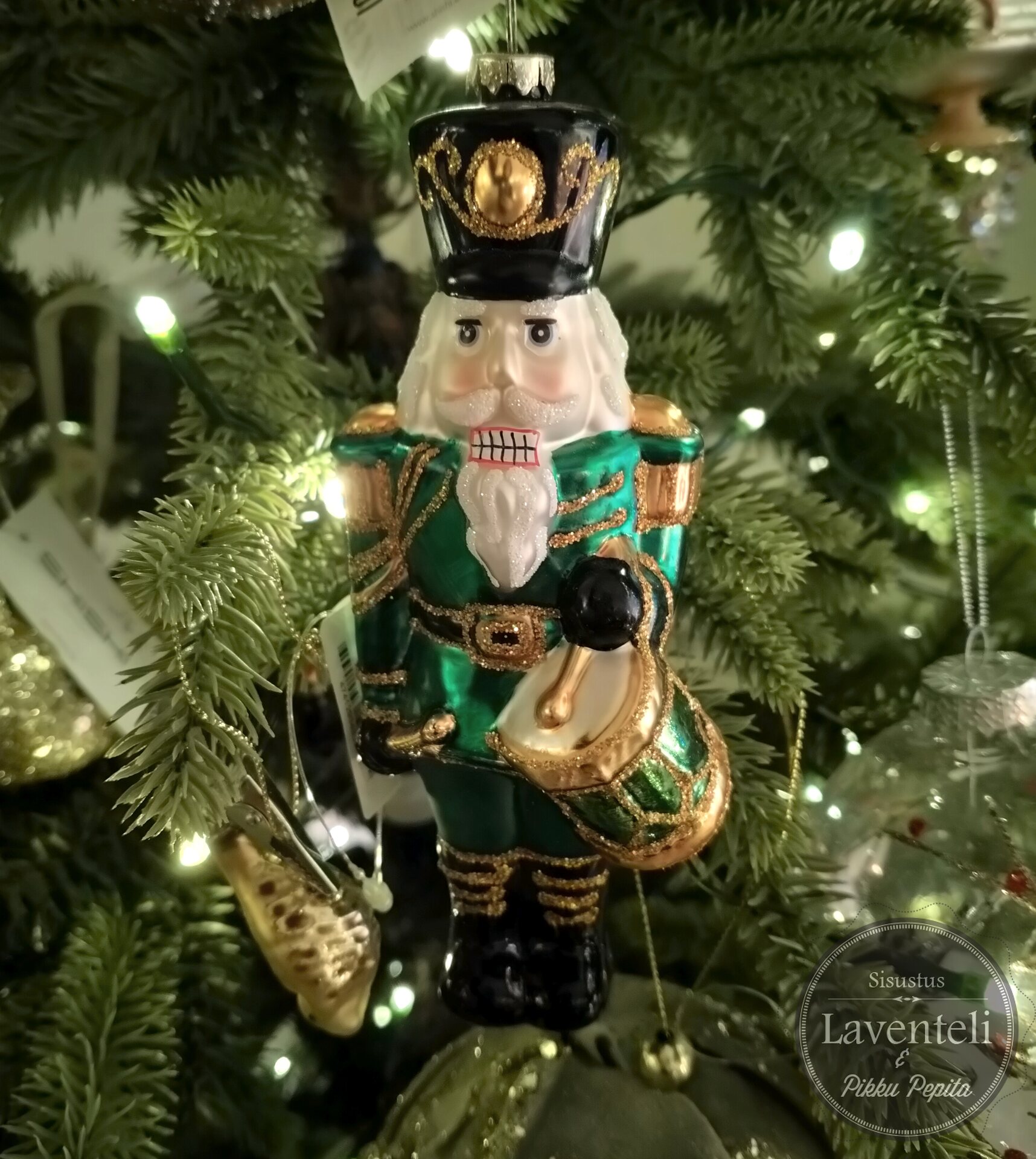 Kaksi erilaista värikästä lasista pähkinänsärkijäkoristetta, joissa ripustuslenkki. Voit käyttää joulukuusenkoristeena tai pöydällä asetelmissa.
