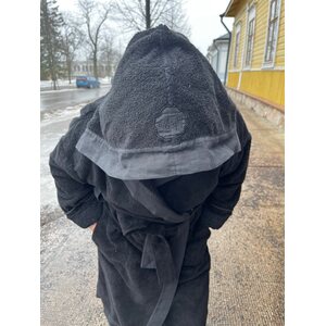 Kylpytakki, joka on hienosti ommeltu pellavasta ja puuvillafroteesta. Hihansuissa hienot mustat pitsit ja edessa reunaa kiertää kaistale pellavaa.