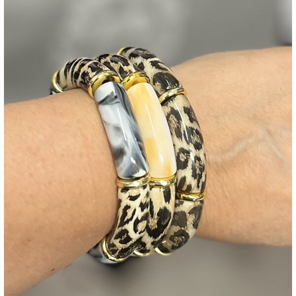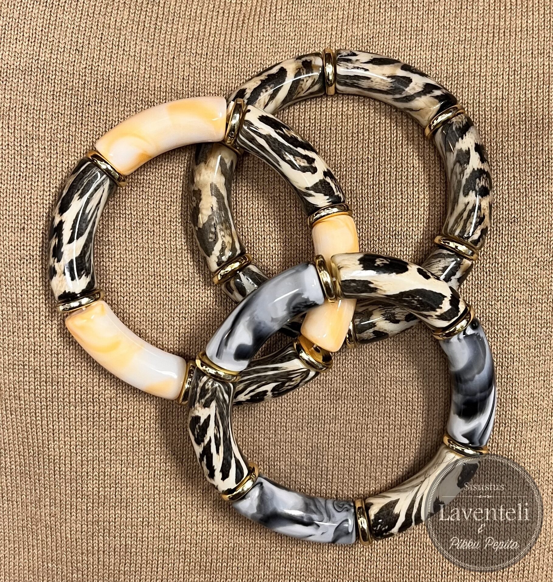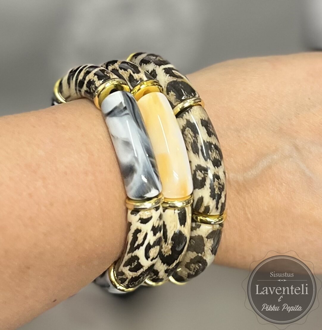 Tyylikäs pantterikuvioinen rannekoru tuo asuusi rohkeaa särmää ja näyttävää eleganssia. Elastinen kuminauha tekee korusta mukavan käyttää ja varmistaa, että se sopii monenkokoiseen ranteeseen.