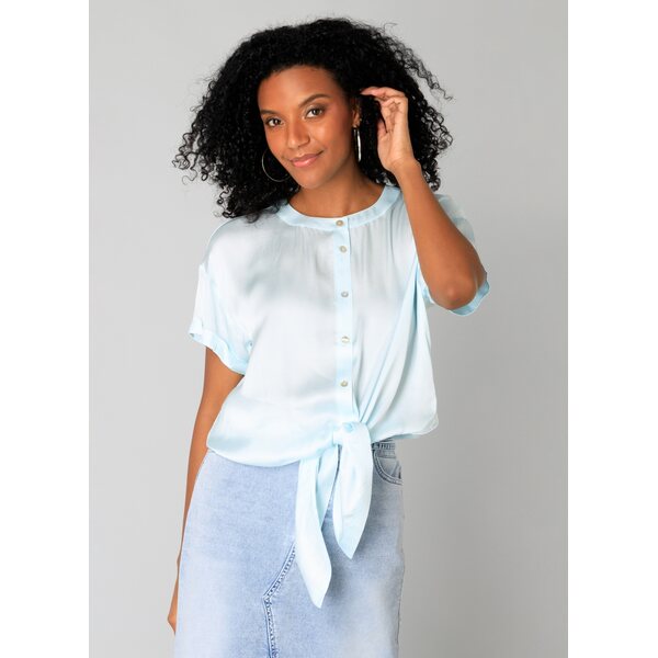 Pusero on valmistettu 100 % Ecovero™-viskoosisatiinista, joka tuntuu pehmeältä ihoa vasten ja laskeutuu upeasti. Hienostunut, kevyt kiilto tuo asuun ripauksen ylellisyyttä, samalla kun hengittävä materiaali tekee paidasta miellyttävän käyttää lämpiminä päivinä.