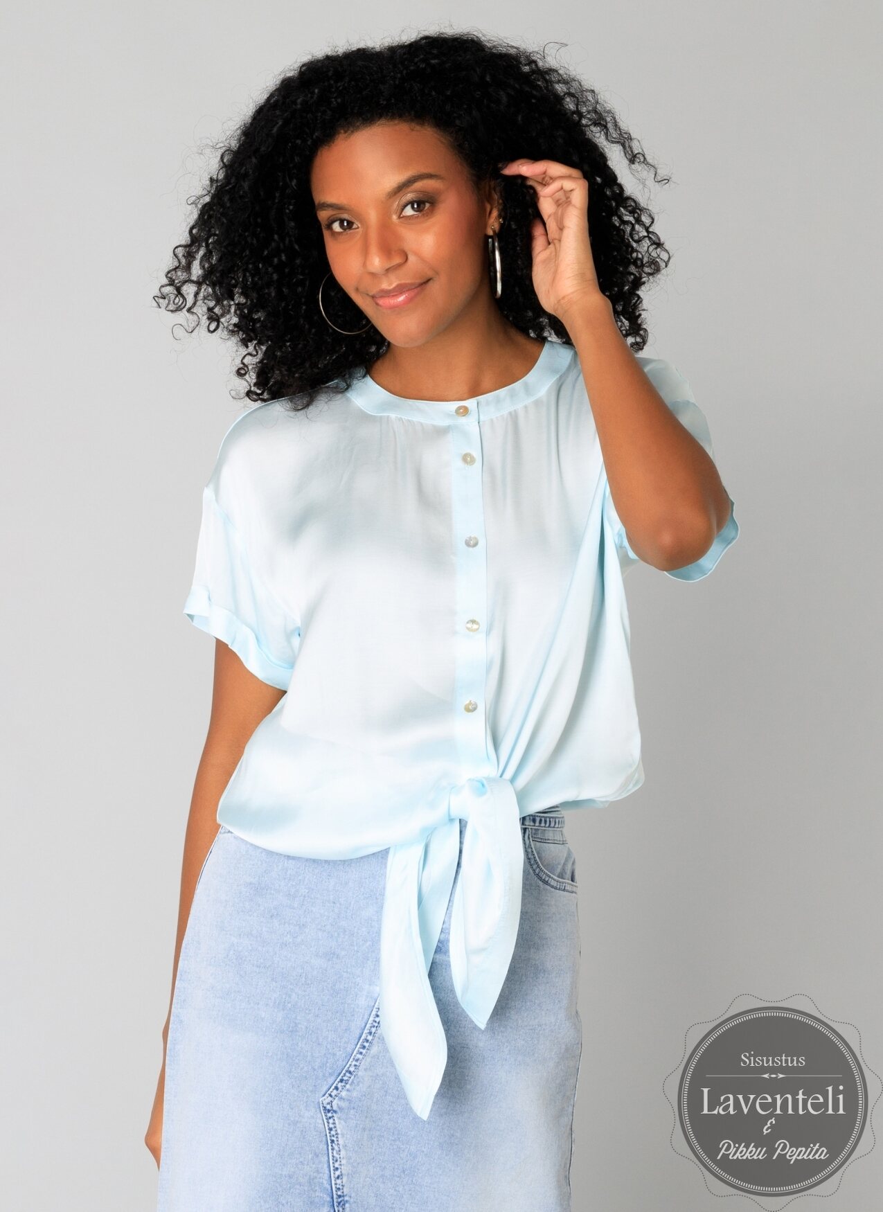Naisellinen malli on viimeistelty lyhyillä hihoilla, pyöreällä pääntiellä sekä kevyesti kietaisumaisella leikkauksella. Helman leikkisä solmittava rusetti tuo kokonaisuuteen persoonallista ilmettä ja viimeistelee tyylin kauniisti.