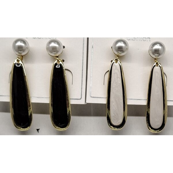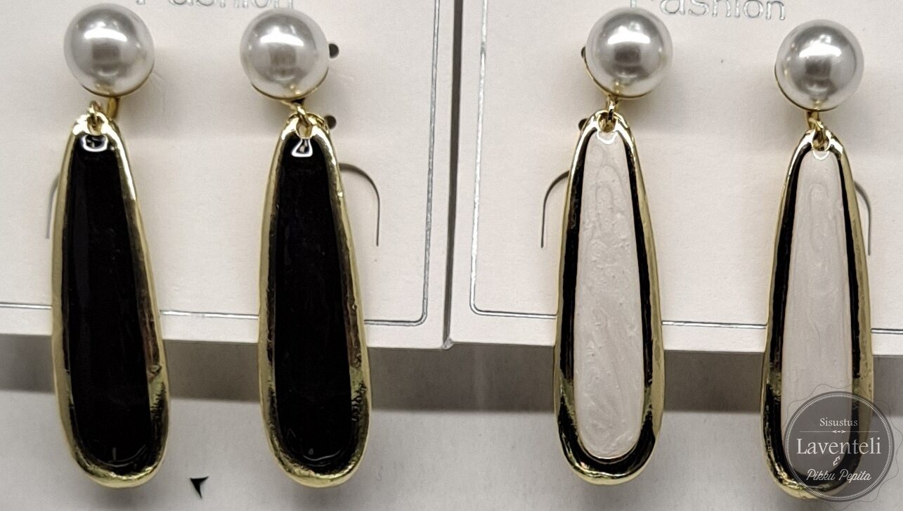 • Vasemmalla: Mustat pitkät pisarat metallinhohtoisilla kultareunuksilla ja helmi yläosassa luovat tyylikkäät klassisen ilmeen.
