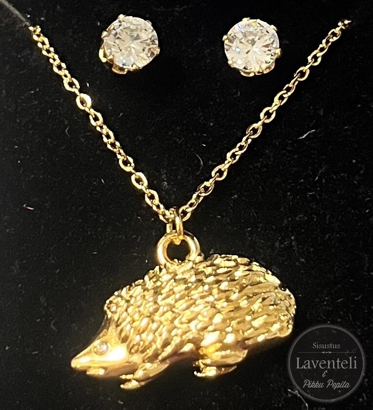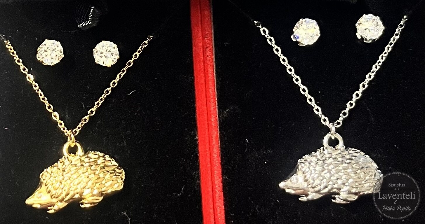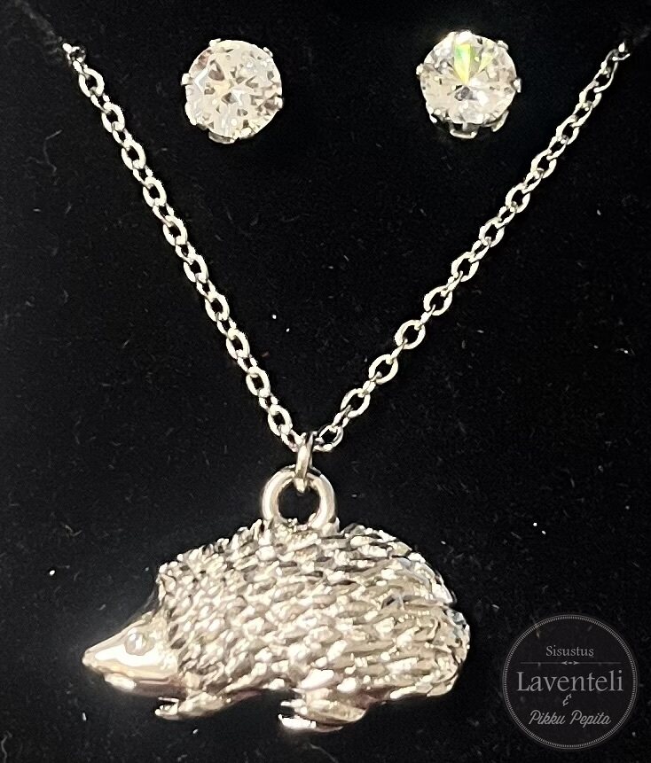 Kaulaketjussa on siili riipus. Korvakorut ovat klassiset “timanttinapit”, jotka täydentävät kokonaisuuden hillityn tyylikkäästi.