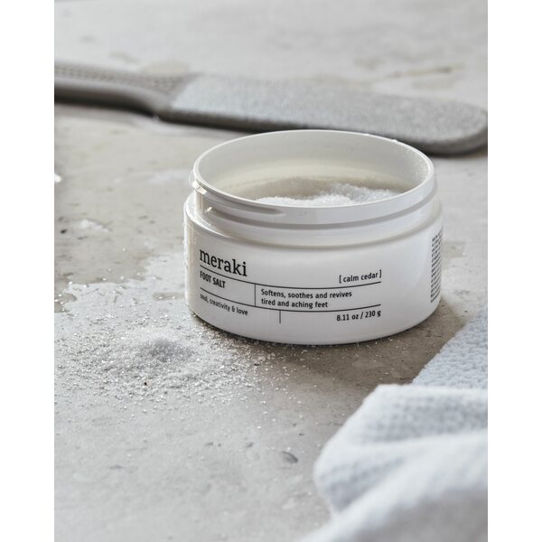 Elvyttää väsyneitä ja kipeitä jalkoja tällä Merakin jalkasuolalla. Calm Cedar -niminen suola on merisuola, joka pehmentää, rauhoittaa ja elvyttää jalkojasi pitkän päivän jälkeen. Rentoudu ja vietä ansaittua aikaa jalkojen liotuksessa samalla kun nautit eukalyptuksen, mintun ja limen energisoivasta tuoksusta. Lisää vain suola haalealla vedellä täytettyyn altaaseen ja sekoita. Suosittelemme 2-3 ruokalusikallista 5 litraan. Jalkojen liottaminen on yksinkertainen ja helppo tapa hemmotella itseäsi töiden jälkeen tai kun haluat vain nauttia rentouttavasta hetkestä. ECOCERT Natural -sertifioitu.