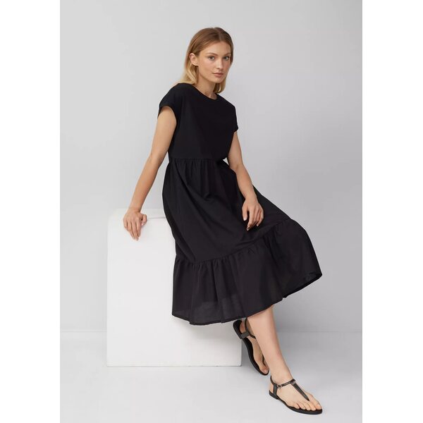 Tämä s.Oliverin musta puuvillamekko on täydellinen valinta sinulle, joka arvostat mukavuutta, luonnollisia materiaaleja ja ajatonta tyyliä. Pehmeästä 100 % puuvillajerseystä valmistettu mekko tuntuu miellyttävältä ihoa vasten ja laskeutuu kauniisti, tehden siitä ihanteellisen arjen luottovaatteen keväästä syksyyn.