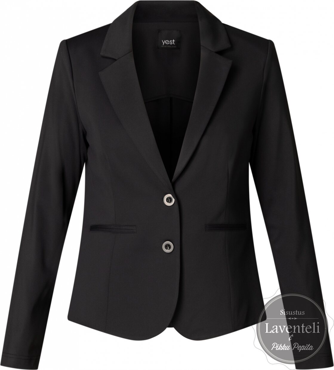 Musta jakku on siisti pidettäväksi mekon tai hameen kanssa, mutta sopii hyvin myös farkkujen kaveriksi. Jakun kangas kiiltävää satiinia.