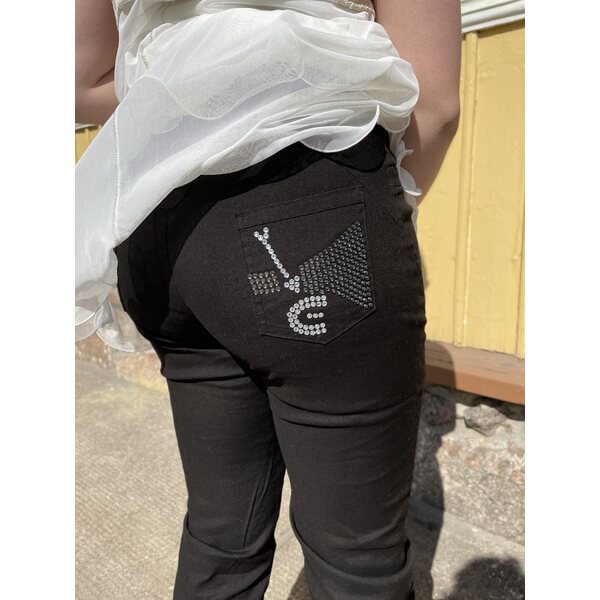 Vyötäröllä on vyölenkit ja housut suljetaan metallisella vetoketjulla sekä EC‑logonapilla, joka on yksi brändin tunnistettavista yksityiskohdista. Oikeassa takataskussa olevat strassikoristeet tuovat housuihin ripauksen ylellisyyttä ja Cavalettille ominaista taiteellista ilmettä.