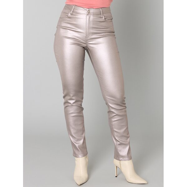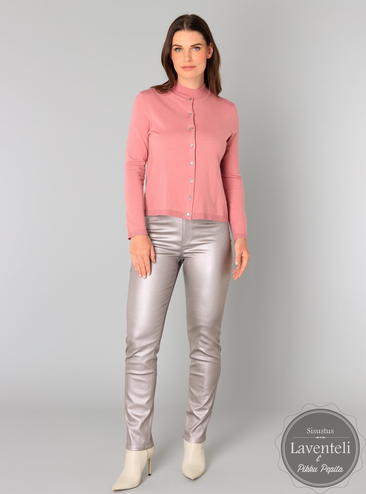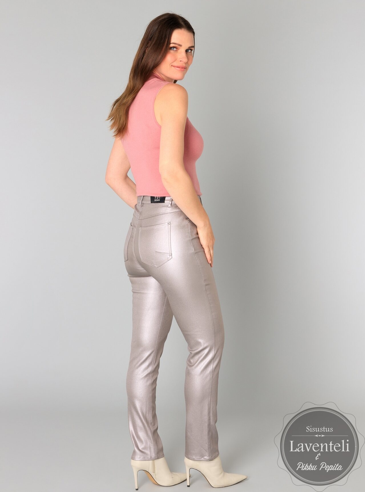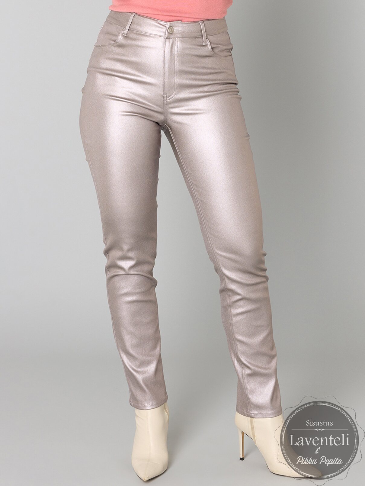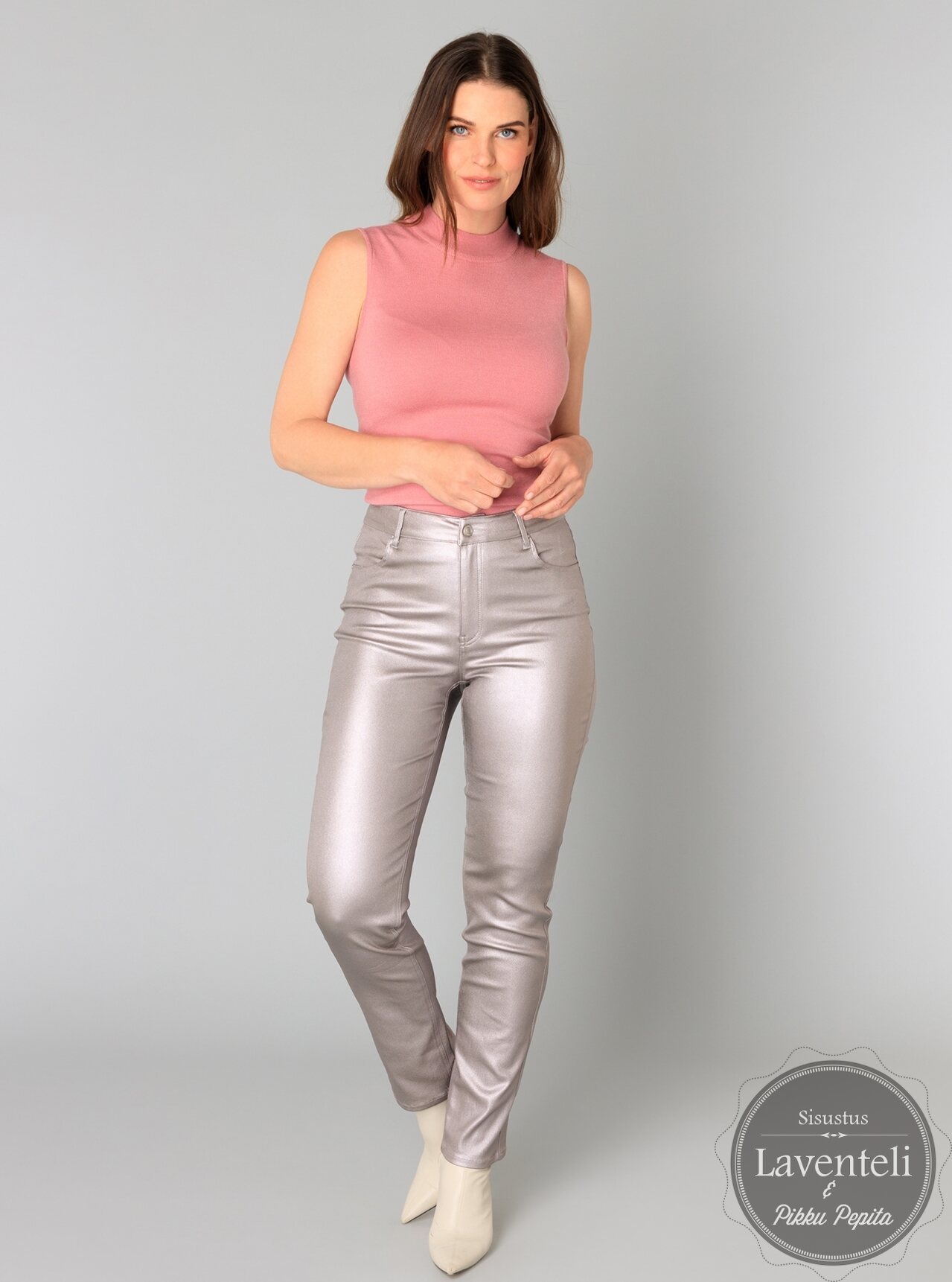 Housujen kiiltävä hopeapinnoite antaa asulle trendikkään ja huomiota herättävän ilmeen, kun taas suora leikkaus pitää kokonaisuuden tyylikkäänä ja helposti yhdisteltävänä. Mukava materiaali joustaa kevyesti ja tuntuu miellyttävältä päällä koko päivän.