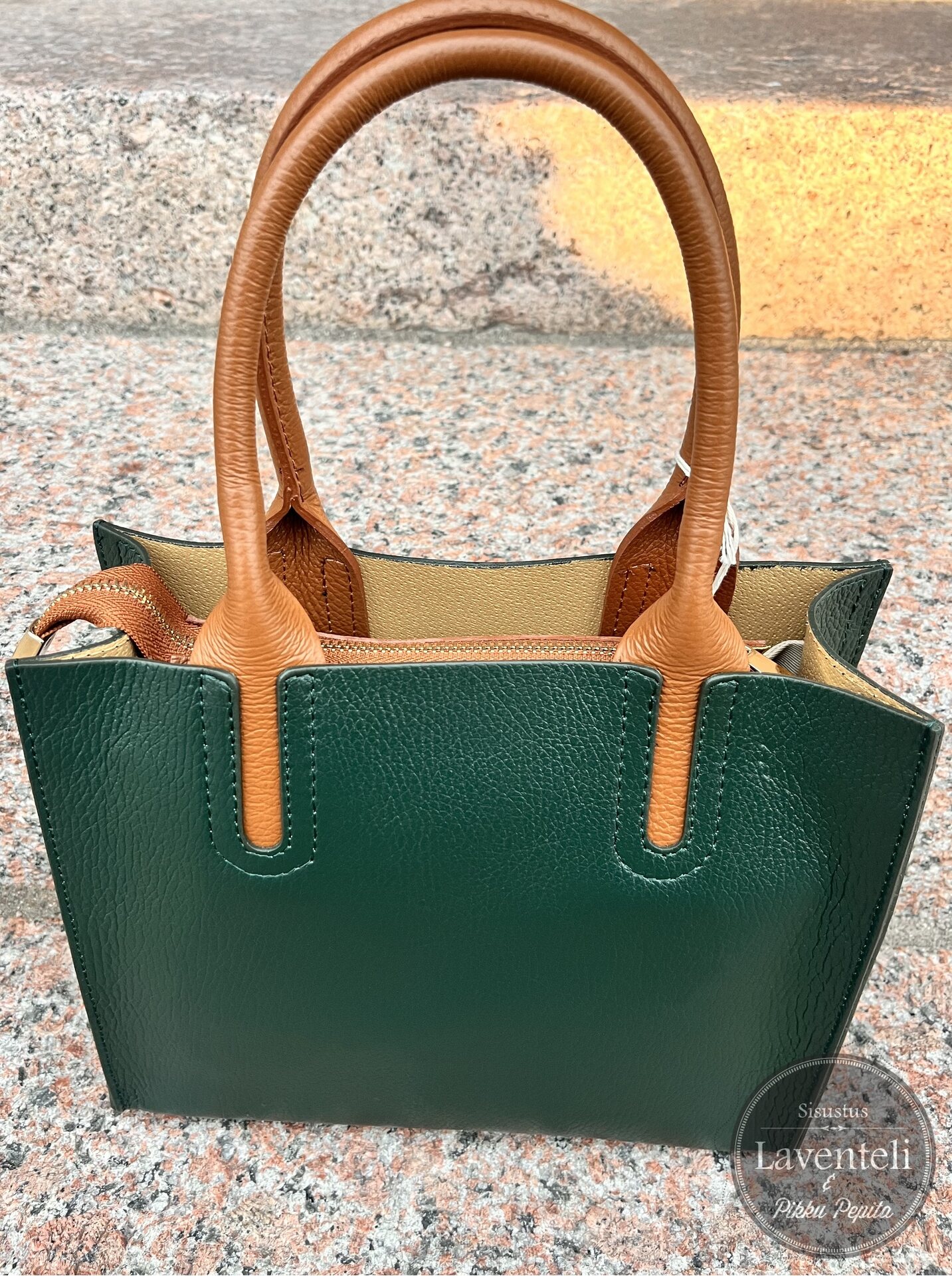 Tyylikäs nahkainen käsilaukku, jossa ajaton muotoilu ja laadukas viimeistely. Malli suljetaan kätevästi vetoketjuilla ja tavarasi ovat turvassa – täydellinen valinta jokapäiväiseen käyttöön. Vetoketjun alla vuoritettu sisäosa, jossa vetoketjullinen sivutasku.