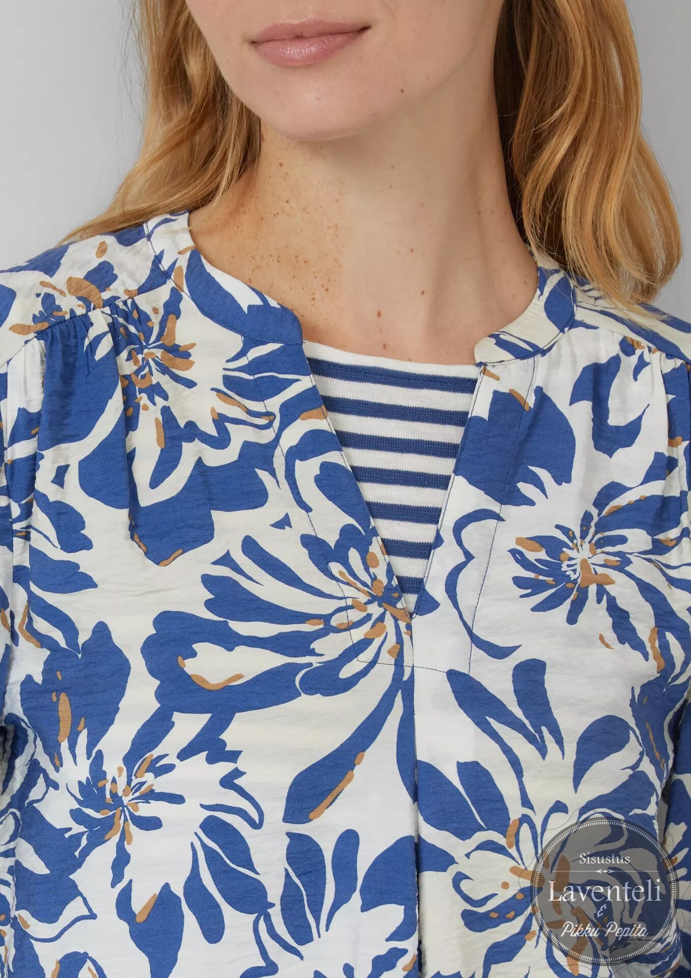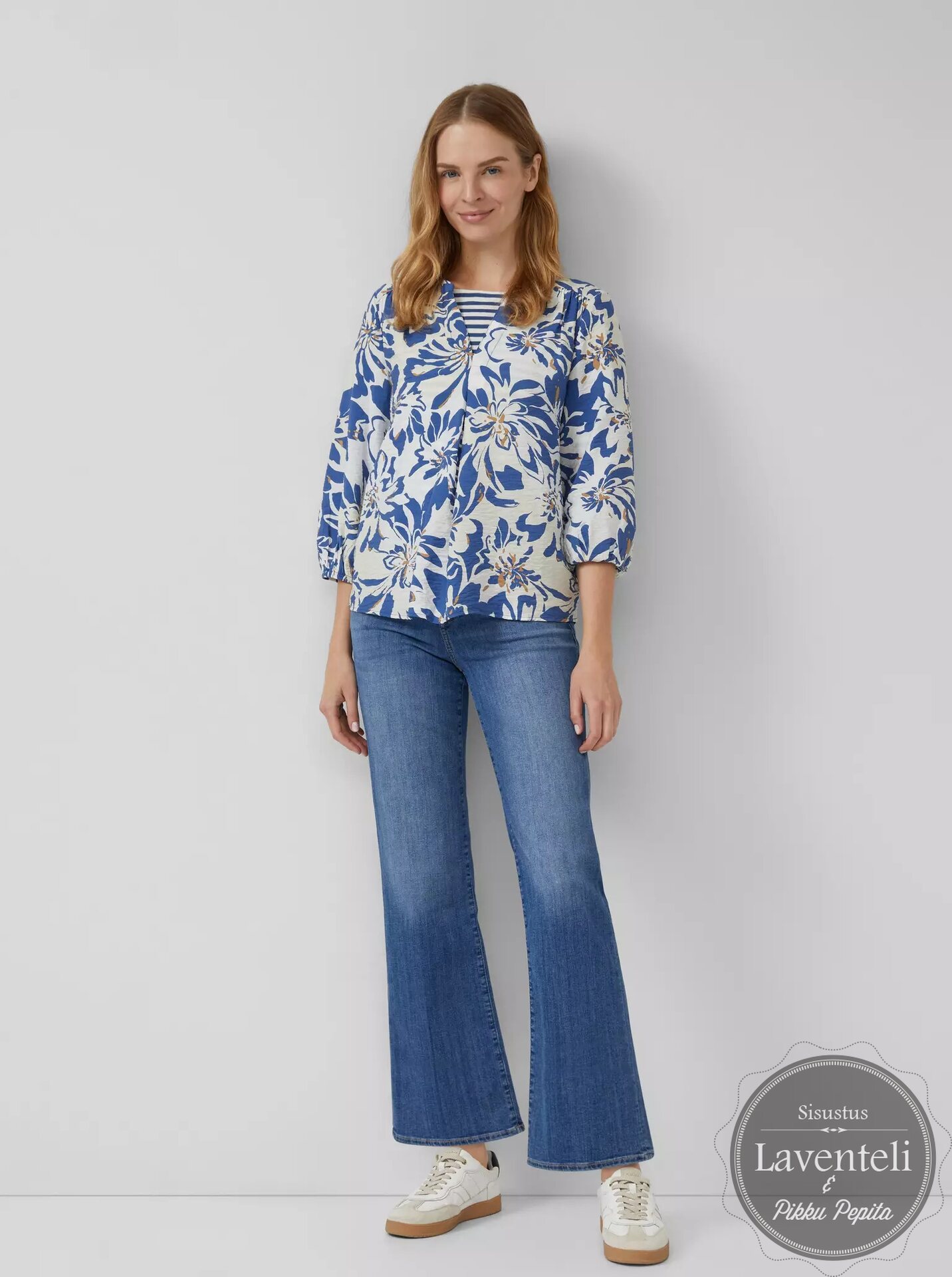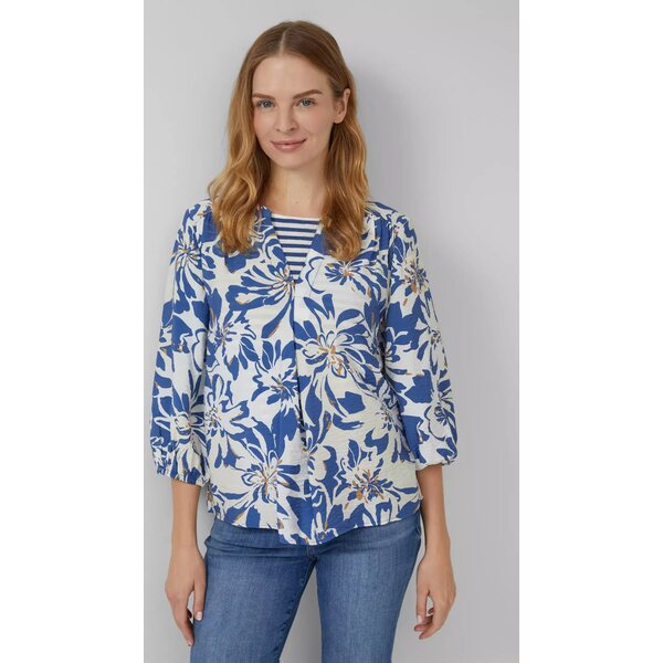 Paidassa yhdistyvät pyöreä pääntie ja kevyt V-muoto, jotka tuovat ilmeeseen keveyttä ja imartelevan linjan. 3/4-pituiset hihat joustavilla hihansuilla lisäävät mukavuutta ja antavat paidalle rennon mutta huolitellun ilmeen. Kukkakuosi ja sinisen sekä moniväristen sävyjen yhdistelmä tekevät paidasta helposti yhdisteltävän farkkujen, suorien housujen tai hameiden kanssa. Valkoinen pohjaväri, jossa sinisävyisiä kukkia.