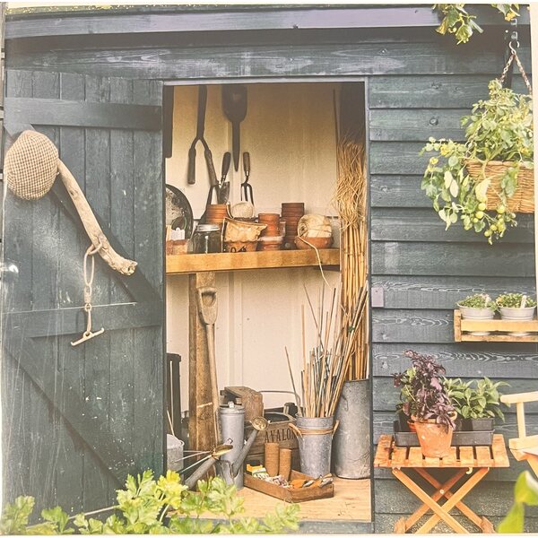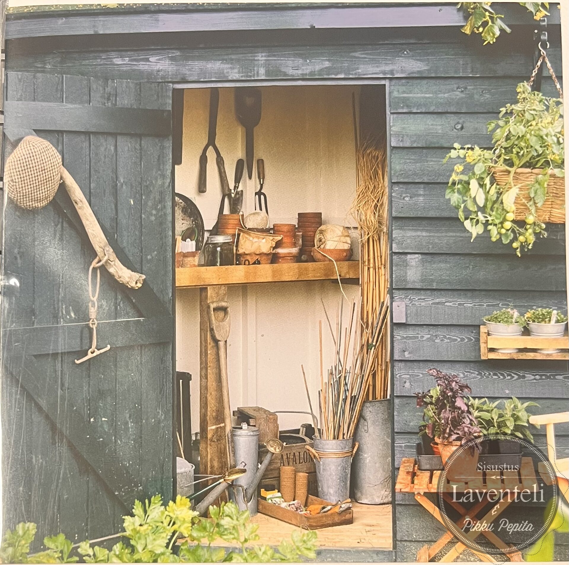 Kortin kuvassa avoinna oleva pihavajan ovi kutsuu kurkistamaan sisään – näkyvissä on puutarhatyökaluja ja lämmin, hieman nostalginen miljöö. Täydellinen valinta puutarhan ystävälle, mökkeilijälle tai luonnonläheisestä tyylistä pitävälle.