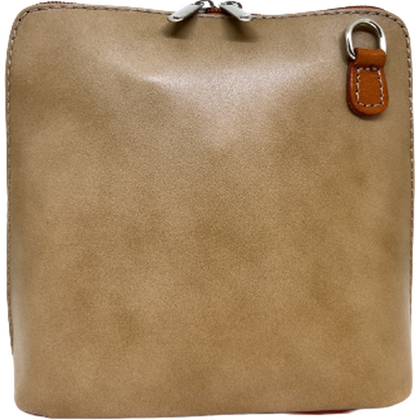 Nahkainen käsilaukku. Ulkopuolella vetoketjulla suljettava pieni tasku.