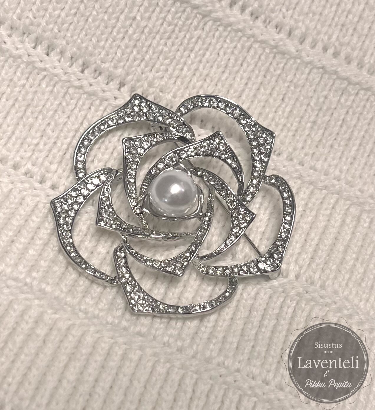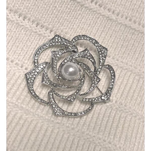 Tämä upea hopeanvärinen rintaneula hurmaa elegantilla kukkamuodollaan ja runsaalla kimalluksellaan. Kerrokselliset, kauniisti kaartuvat terälehdet on koristeltu säihkyvillä strasseilla, ja keskellä loistaa hillitty, helmeä muistuttava yksityiskohta, joka tuo koruun klassista arvokkuutta.