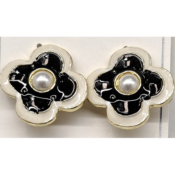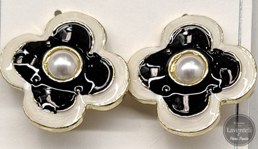 Nämä uniikit emaloidut klipsikorvakorut tarjoavat eleganssin kaikkiin klassisiin tyyleihin. Korvikset ovat kukan muotoiset ja niissä on helmi keskellä. Kukan terälehdet mustat ja valkoiset.