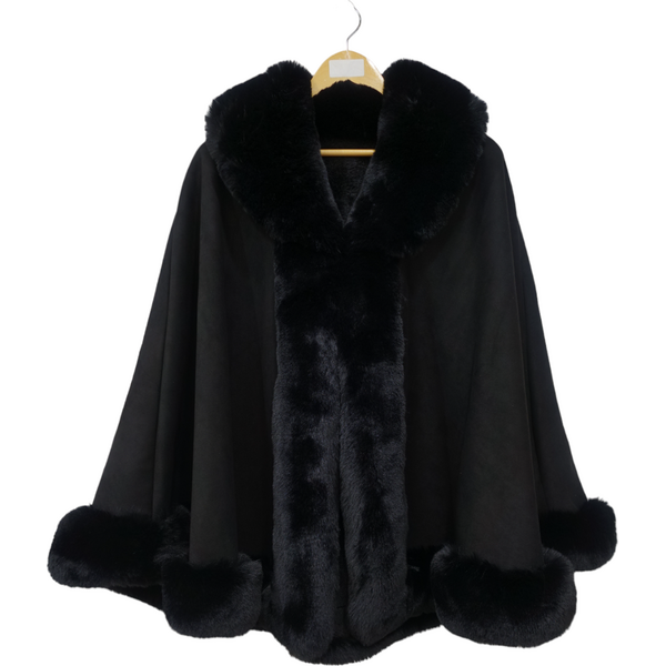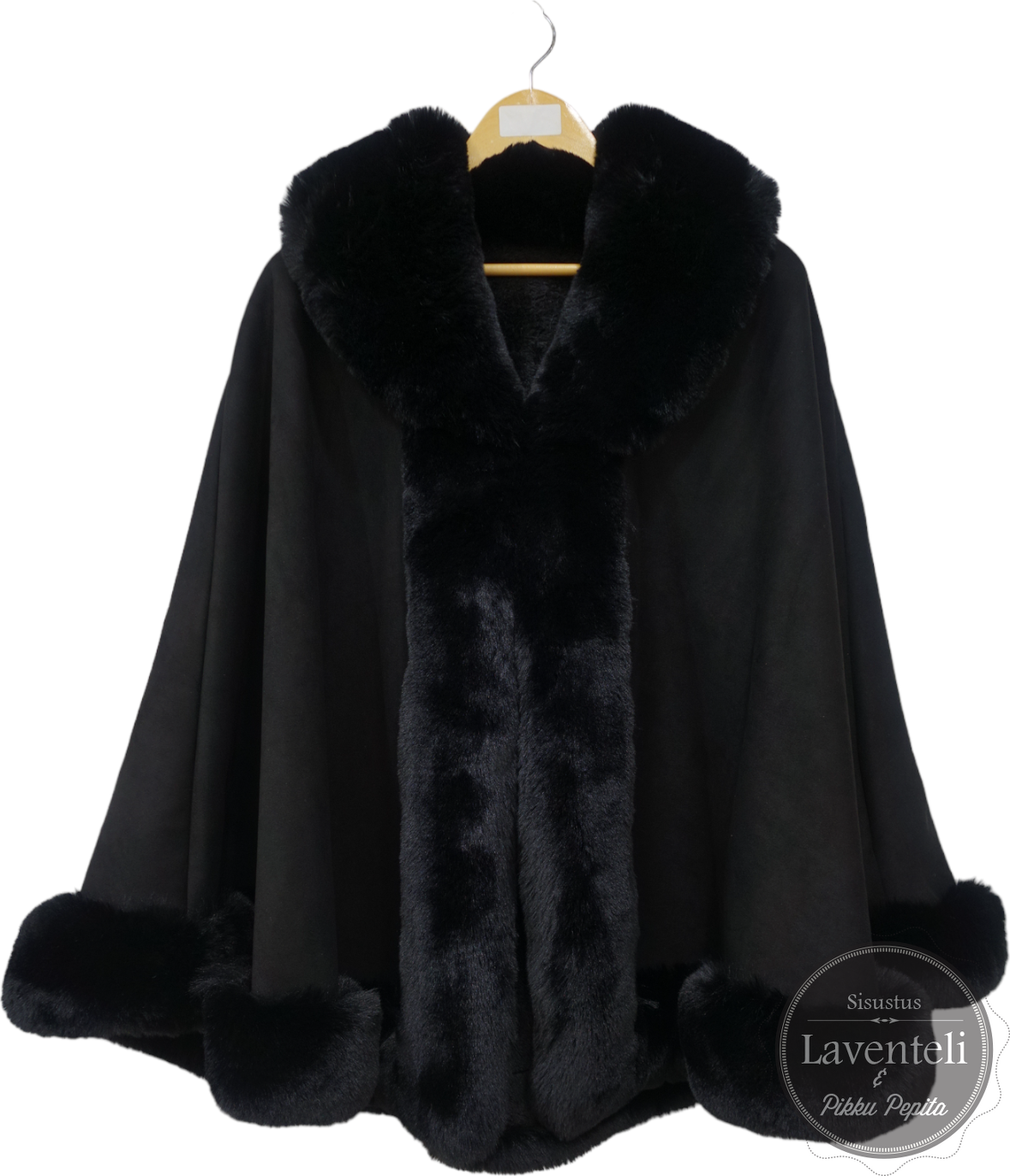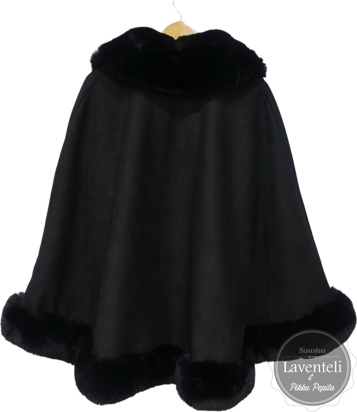 Tämä ylellinen viitta tuo tyyliin pehmeyttä, lämpöä ja ripauksen juhlavuutta. Viittaa reunustava musta keinoturkis luo näyttävän viimeistelyn, joka sopii täydellisesti niin arkipukeutumiseen kuin juhlavaatteiden ylle.