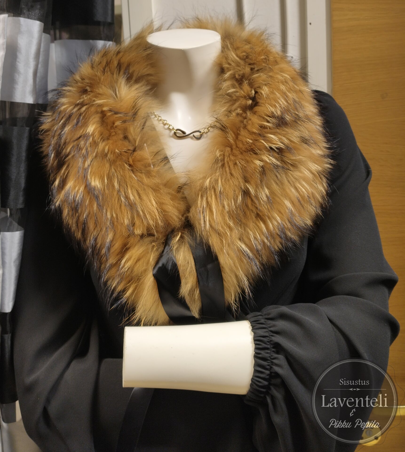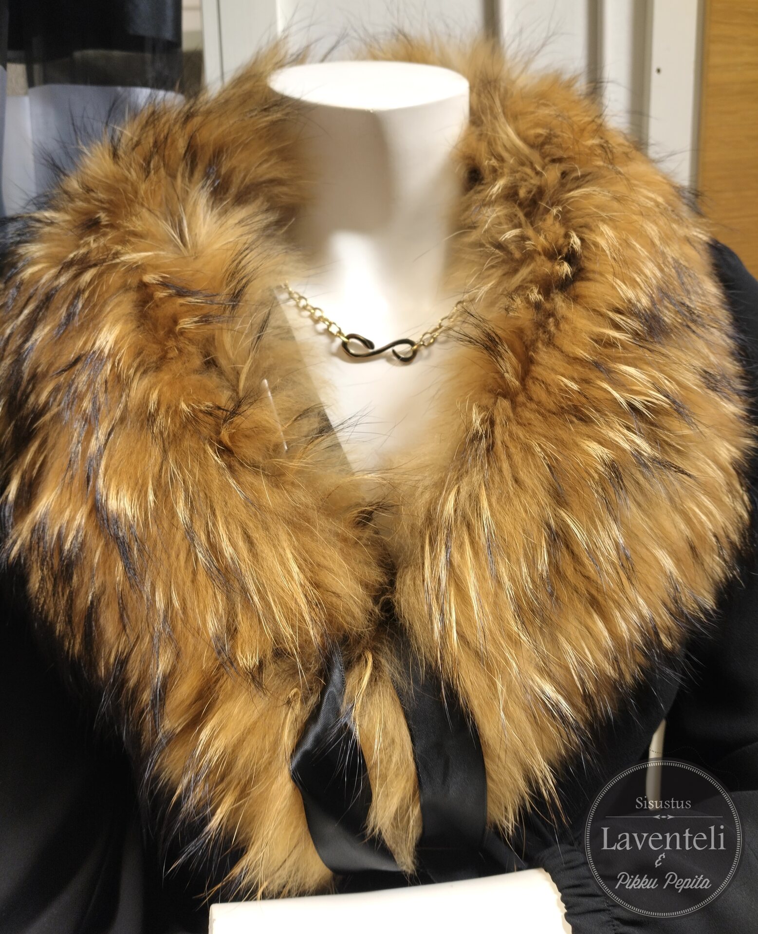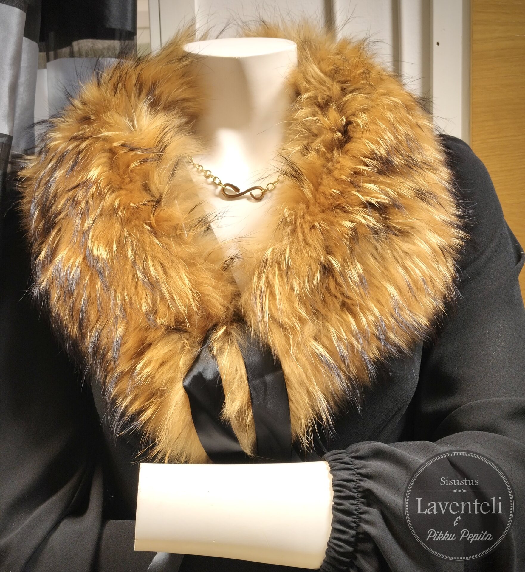 Turkiskalulus aitoa turkista. Laskeutuu kauniisti alas kauluksesta rinnalle. Erittäin lämmin.