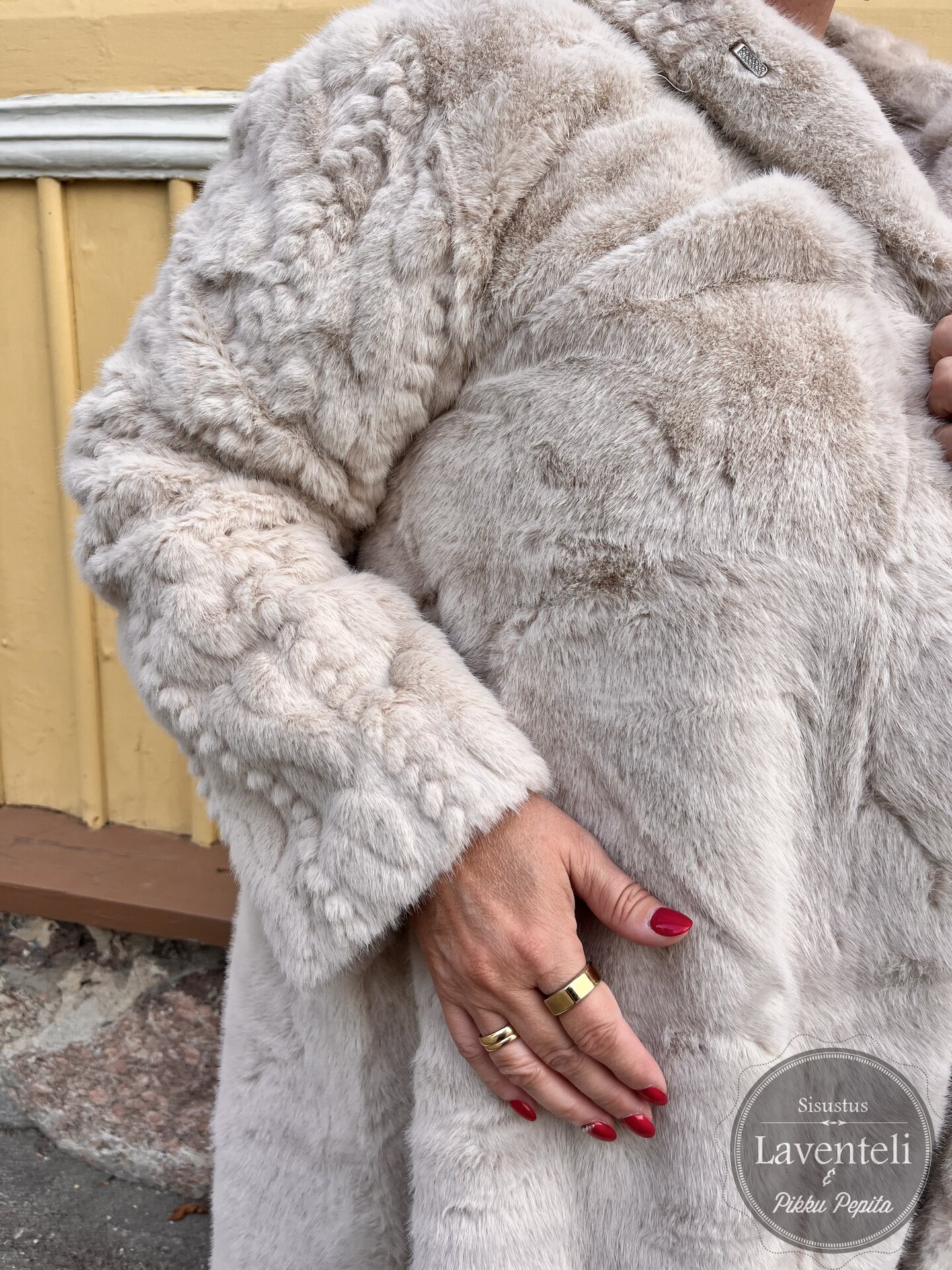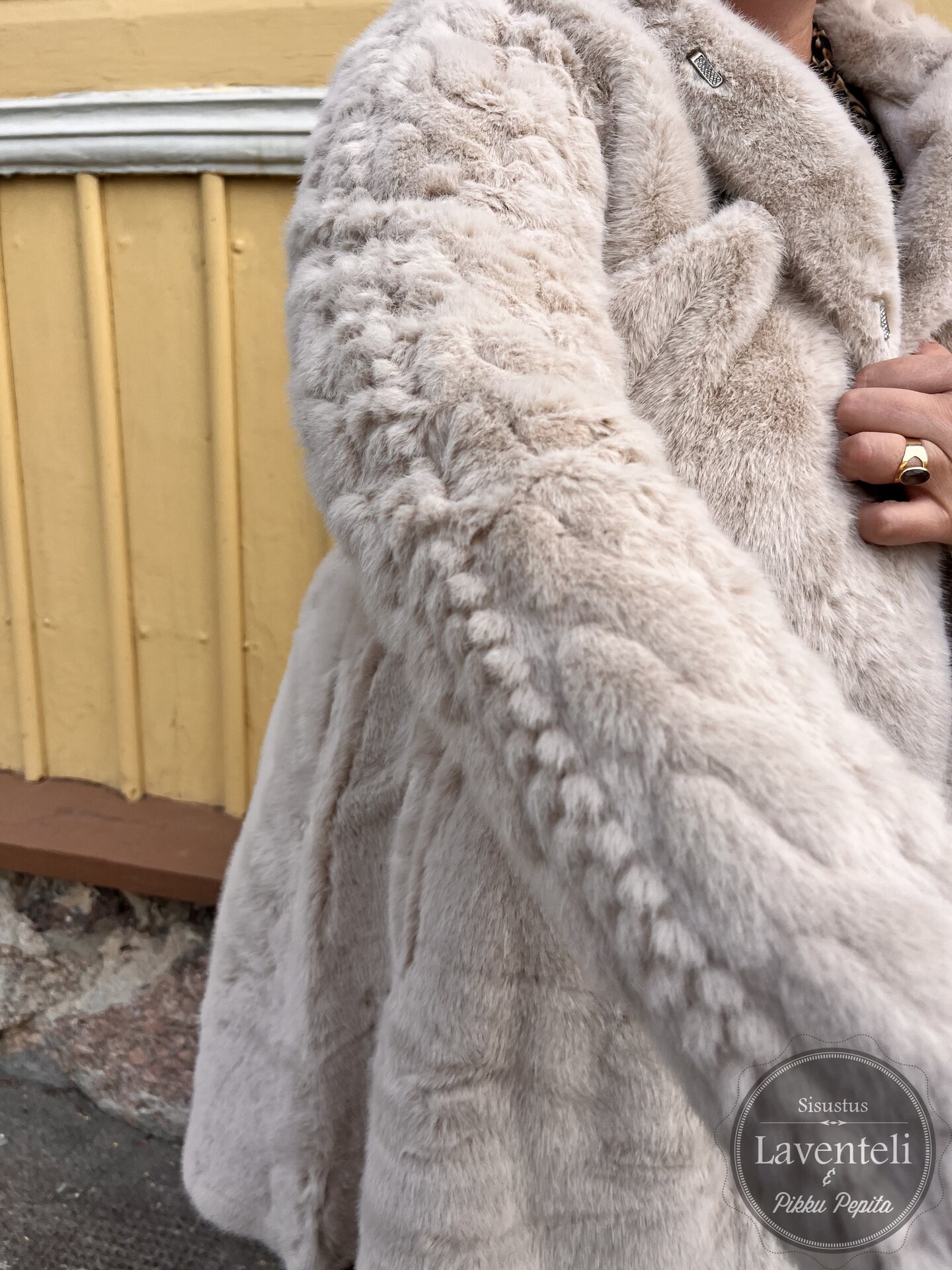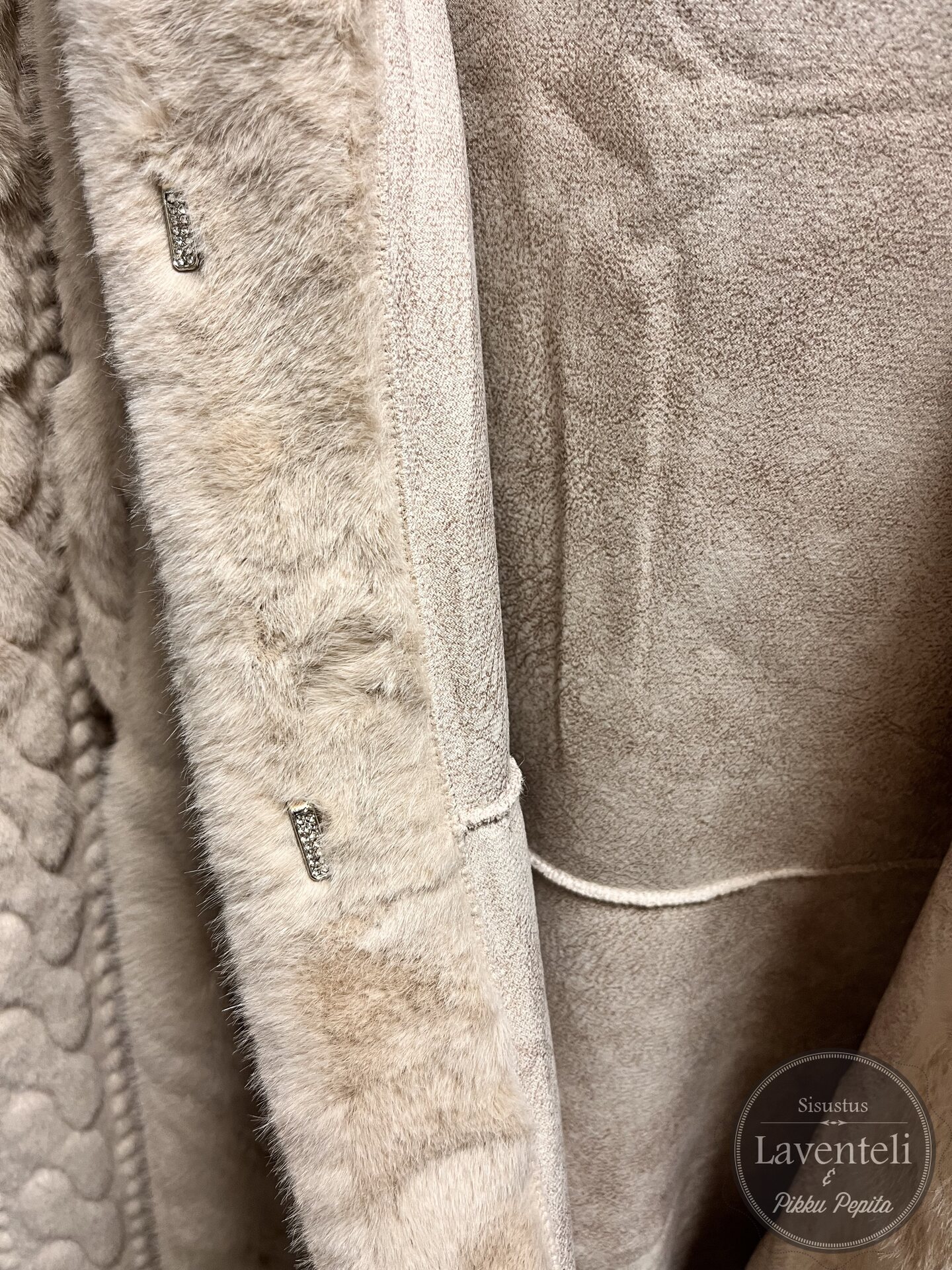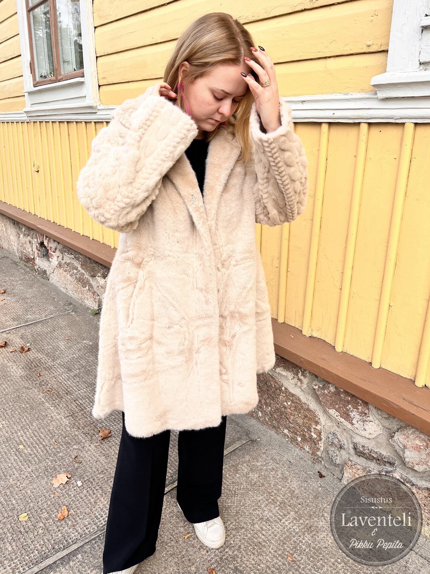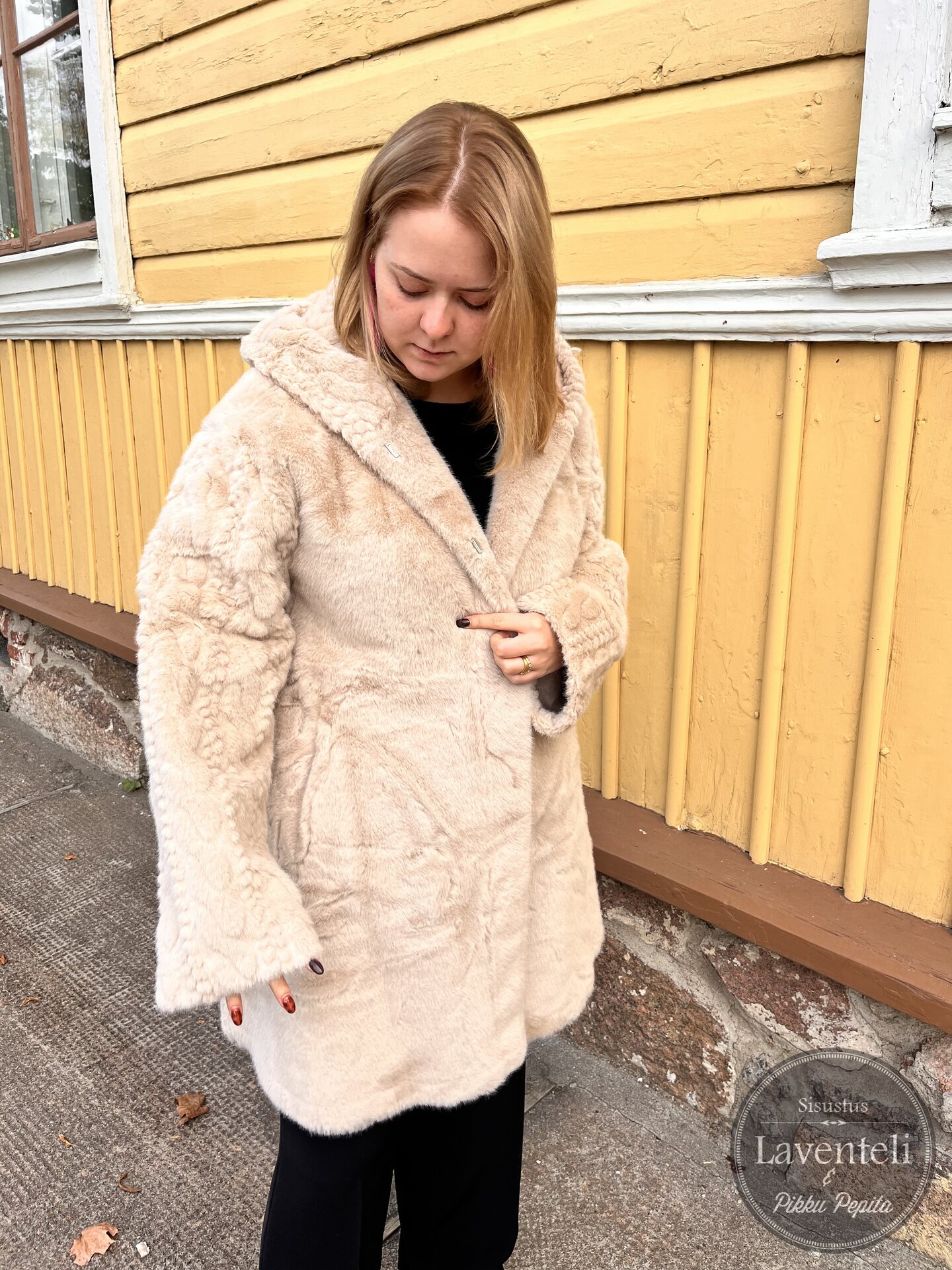 Pehmeä, vaalea norsunluunvärinen keinoturkis takki.