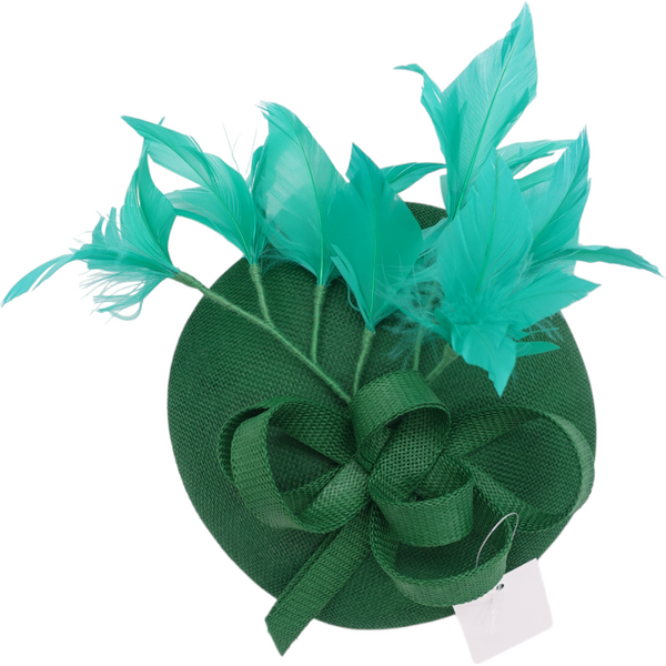 Koristeessa on värjättyjä sulkia ja punottua sisalnauhaa sekä pieni hatun korvike.