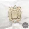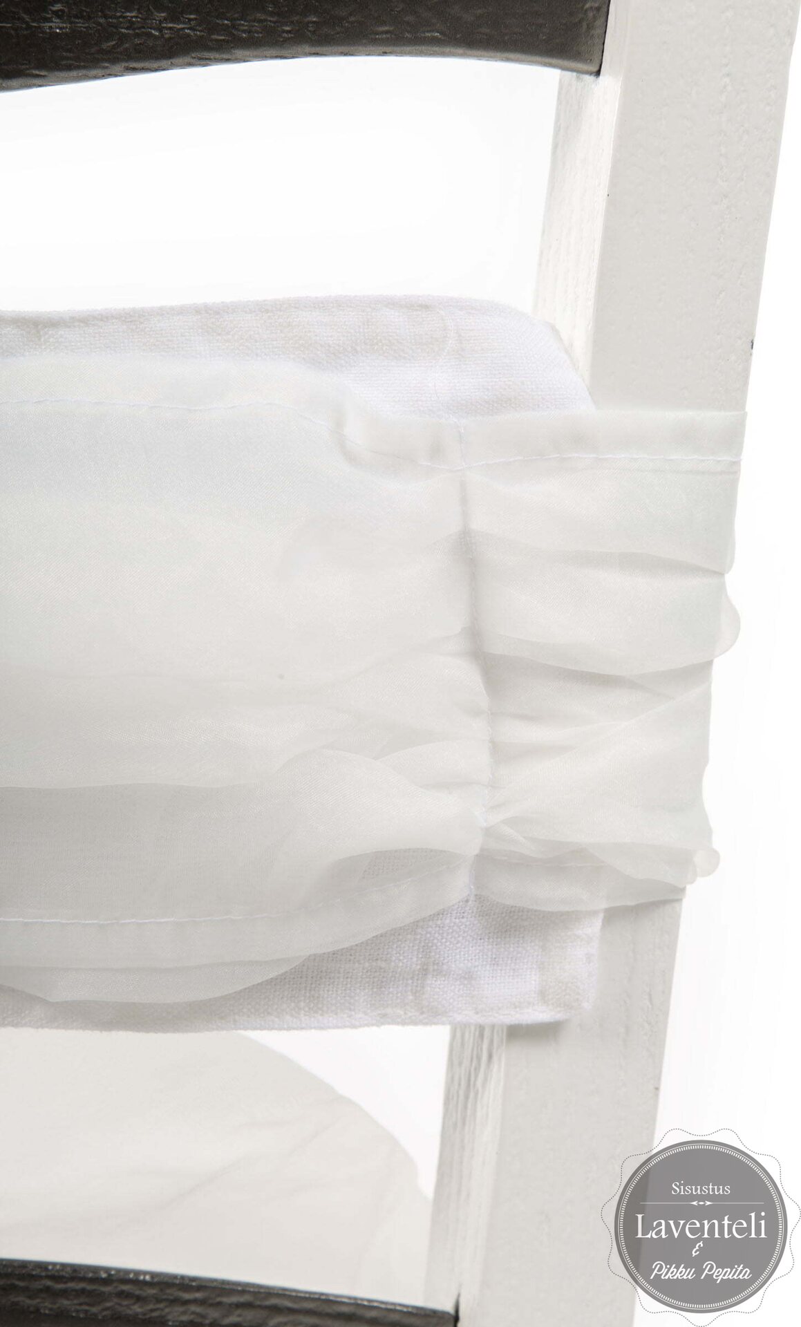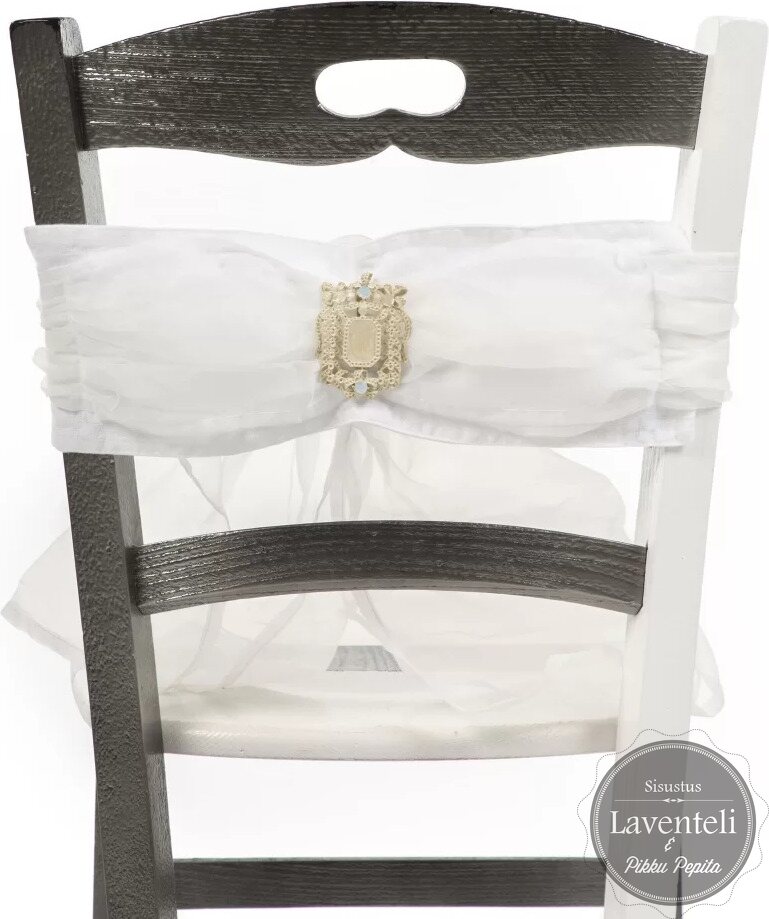 Pellavakaistale 13x40 cm, jossa kaunis metallikoriste kristallein. Koristeen koko 6x5 cm on hakaneulalla irrotettava. Sidontanauhat ovat polyesteriä.
