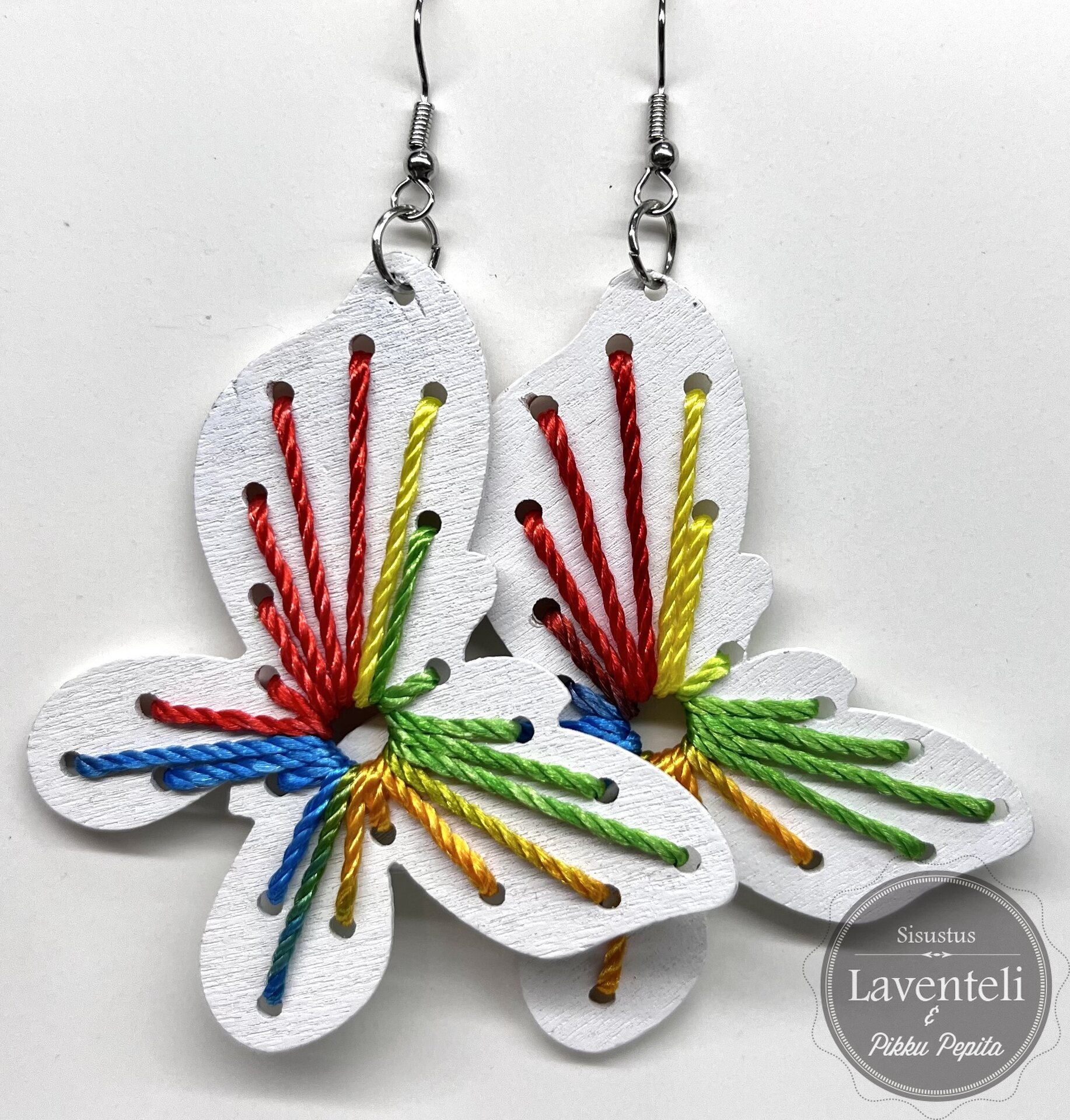 Tuotteen kuvausKiva kesäinen iso perhonen korvakoru. Ohutta ja kevyttä vaneria, johon on pujotettu värikästä lankaa.