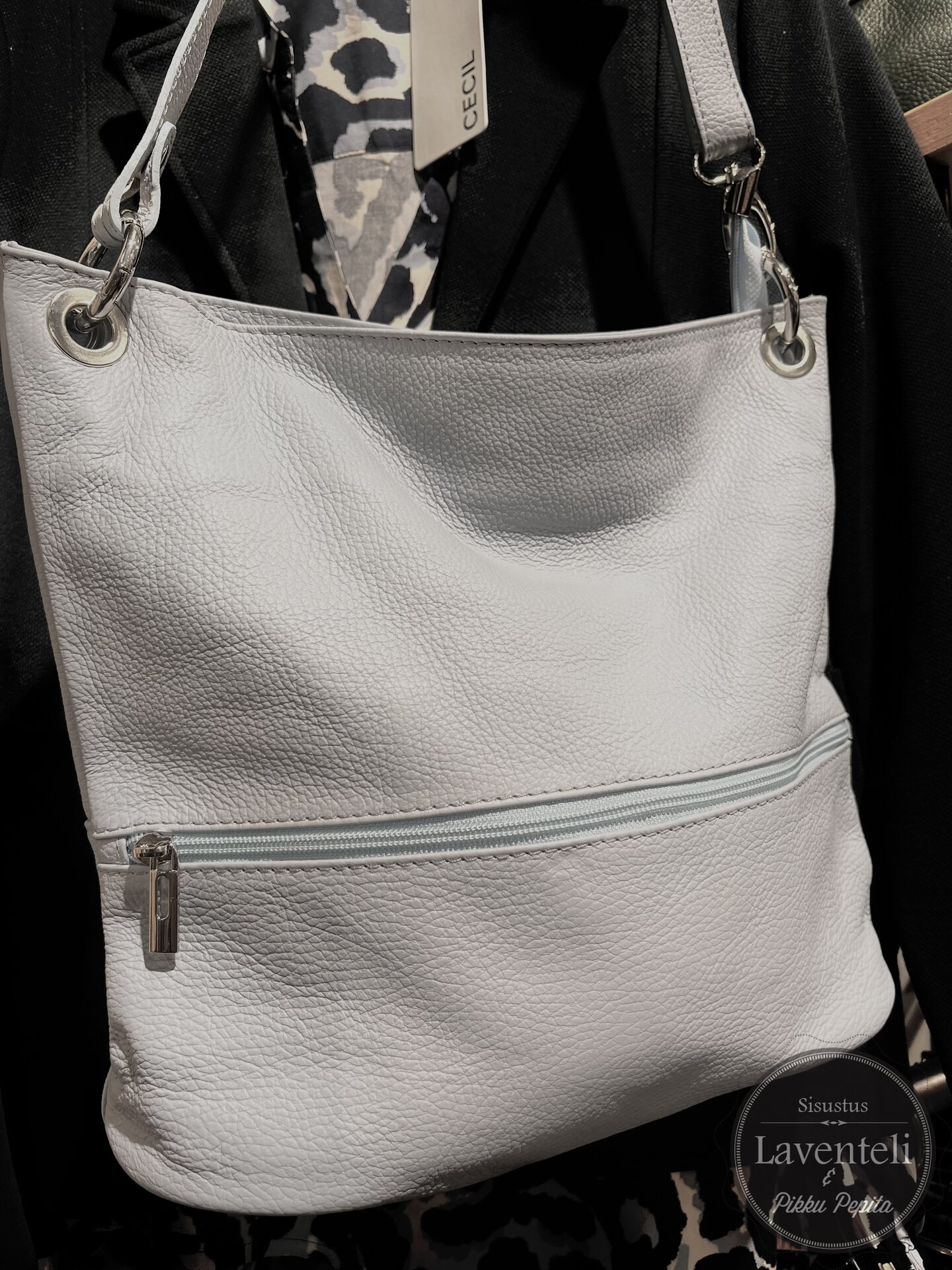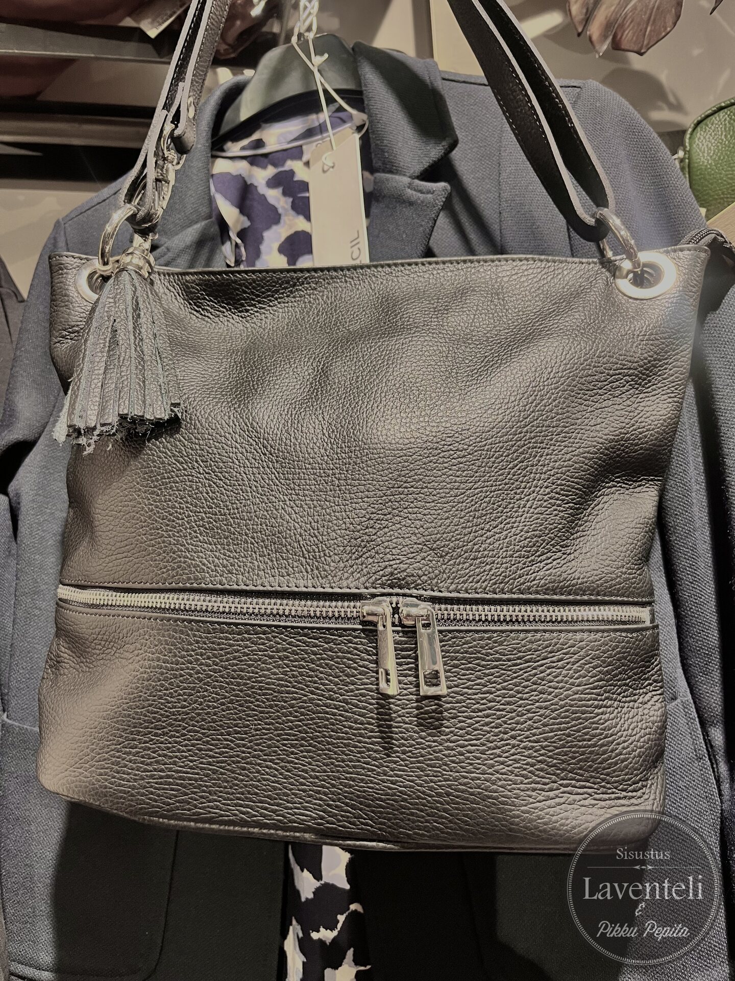 Suurehko nahkainen käsilaukku, jossa useampi tasku ja tupsukoriste. Malli suljetaan kätevästi vetoketjuilla ja tavarasi ovat turvassa – täydellinen valinta jokapäiväiseen käyttöön. Vetoketjun alla vuorikankaasta ommeltu väliosa, jossa vetoketjullinen tasku.
