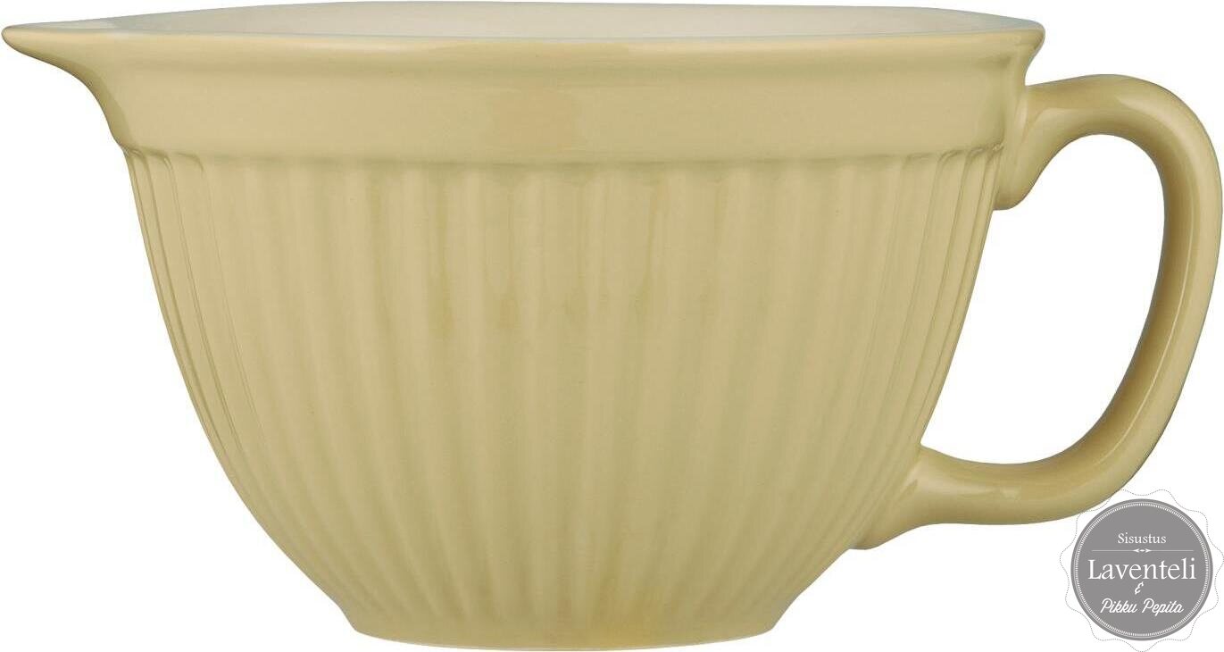 Tämä vaaleankeltainen keraaminen kulho yhdistää arjen käytännöllisyyden ja kauniin muotoilun. Sivussa oleva tukeva kahva tekee kulhosta helpon käsitellä ja miellyttävän käyttää niin leivonnassa kuin ruoanlaitossakin.
