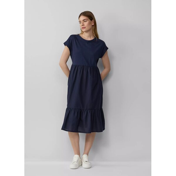 Tämä s.Oliverin tummansininen puuvillamekko on täydellinen valinta lämpimiin kesäpäiviin. Luonnollisia materiaaleja ja ajatonta tyyliä rennolla otteella. Pehmeästä ja joustavasta puuvillajerseystä valmistettu mekko hengittää, tuntuu miellyttävältä ihoa vasten ja laskeutuu kauniisti. Ihanteellinen arjen luottovaate koko kesäksi.
