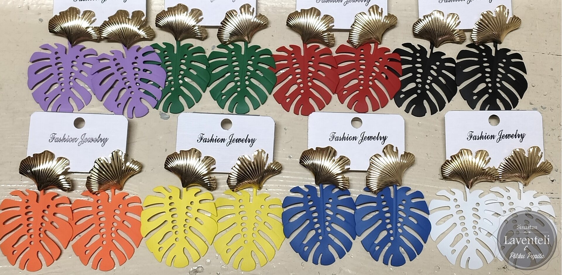 Korvaan kiinnitettävä osa kullanvärinen lehti. Halutessasi voit irrottaa (rikkomalla korviksen) isomman peikonlehden ja käyttää vain kullanväristä lehteä nappikorvakoruna.